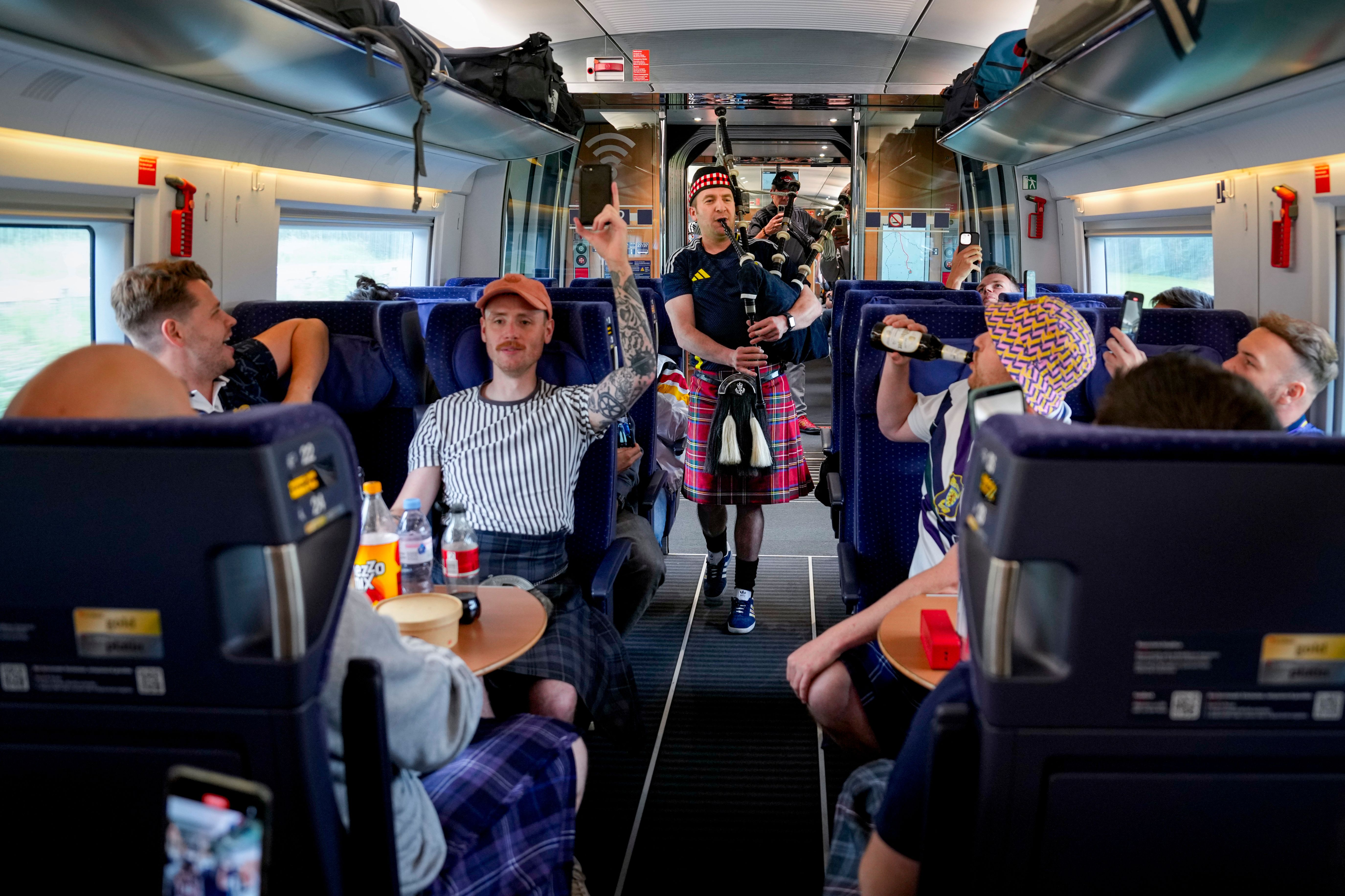 A man plays the bagpipes as passengers cheer and take pictures in a train heading from Berlin to Munich, in Germany, Friday, June 14, 2024 before a Group A match between Germany and Scotland at the Euro 2024 soccer tournament. (Photo by Markus Schreiber/AP Photo)
