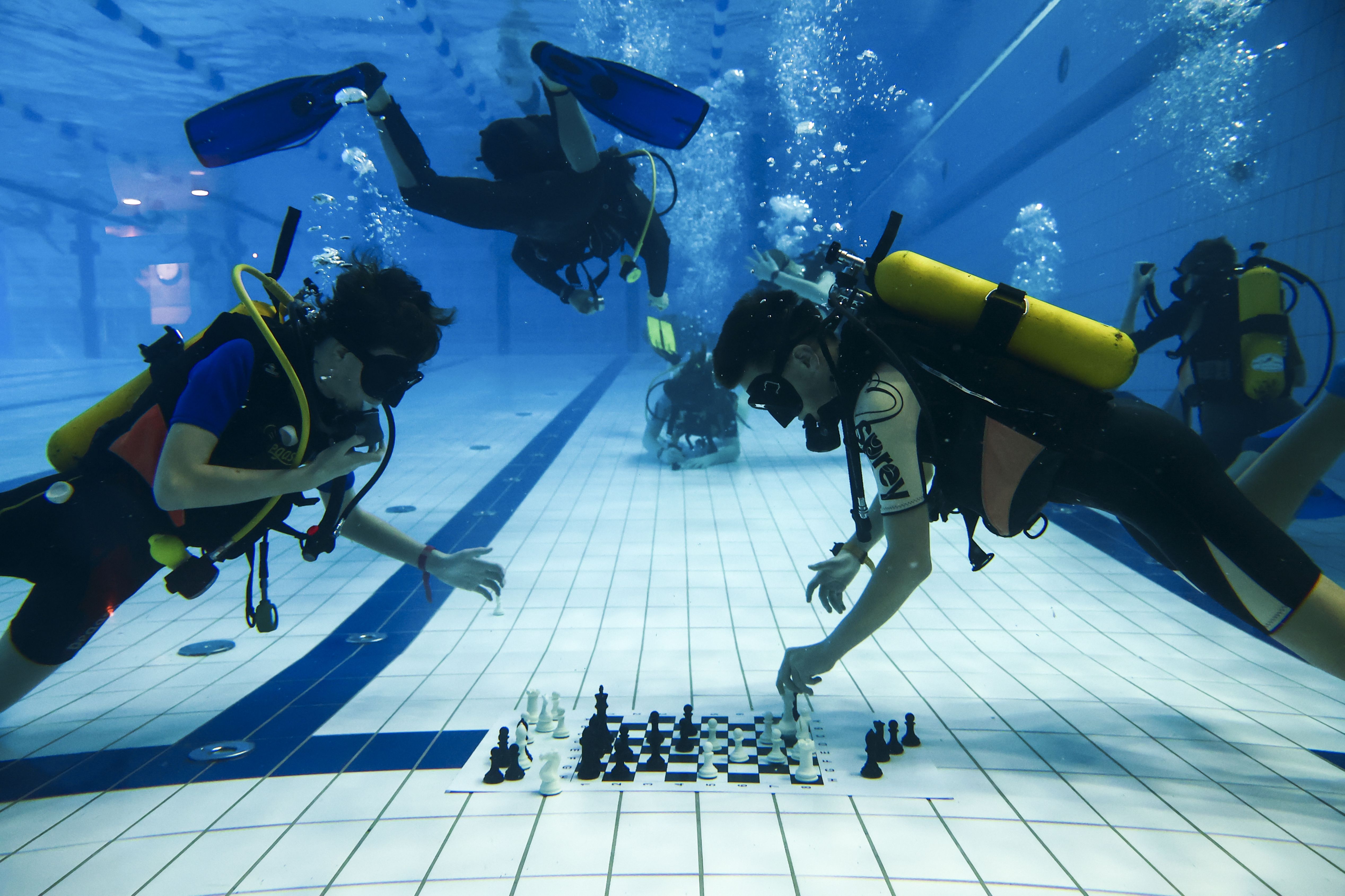People participate in the underwater chess class during a diving course at the swimming pool in Lublin, Poland on February 9, 2023. Diving chess is one of the activities during the diving course for youth organising by Dive Service company and a league of this sport discipline starts in the city. (Photo by Jakub Porzycki/Anadolu Agency via Getty Images)