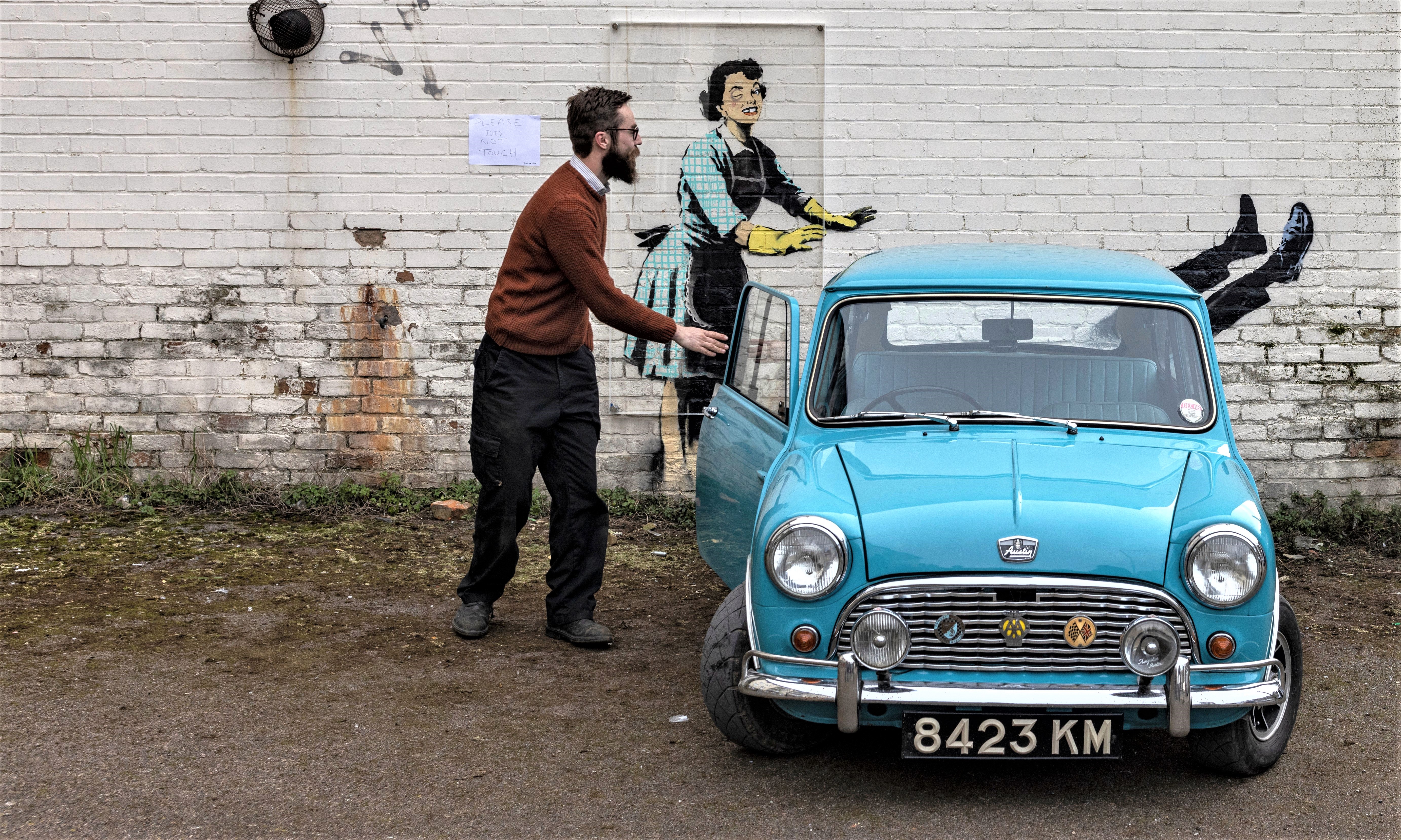 A man parks his car to take a photograph next to a new artwork called “Valentine’s Day mascara” on February 15, 2023 in Margate, England. The image, which centres on the theme of violence against women and girls, appeared yesterday, alongside a refrigerator, which featured as part of the artwork. The fridge was promptly moved by Thanet district council, who said it would return “once it has been made safe”. Since then a wheelie bin has appeared as a replacement and a sheet of plastic covering the image with a sign reading 'do not touch'. The artwork now appears to have two private security guards despite being on the wall of a privately owned house backing onto council run property. Locals anticipate the piece will likely be removed and sold at auction. (Photo by Dan Kitwood/Getty Images)