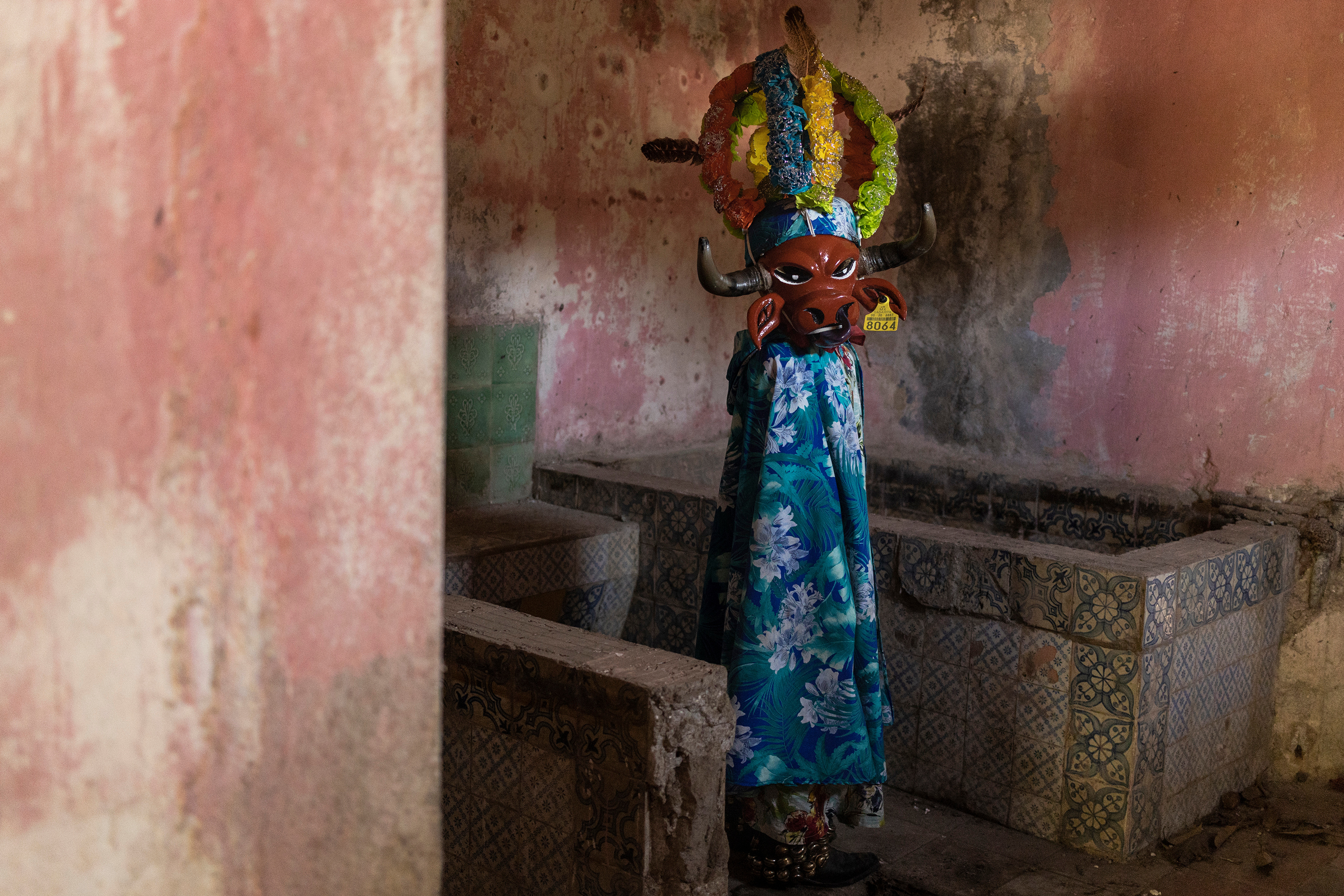 A boy in festive clothing and wearing a wooden mask in the shape of a bull's head poses inside an abandoned hacienda during carnival celebrations on February 27, 2023 in Almolonga, Mexico. Every year, locals from the towns of Coyolillo and Almolonga celebrate carnival to remember their African ancestors, brought as slaves to Mexico mainly from Congo, Ivory Coast, Guinea, Cape Verde, Somalia and Mali. (Photo by Cristopher Rogel Blanquet/Getty Images)