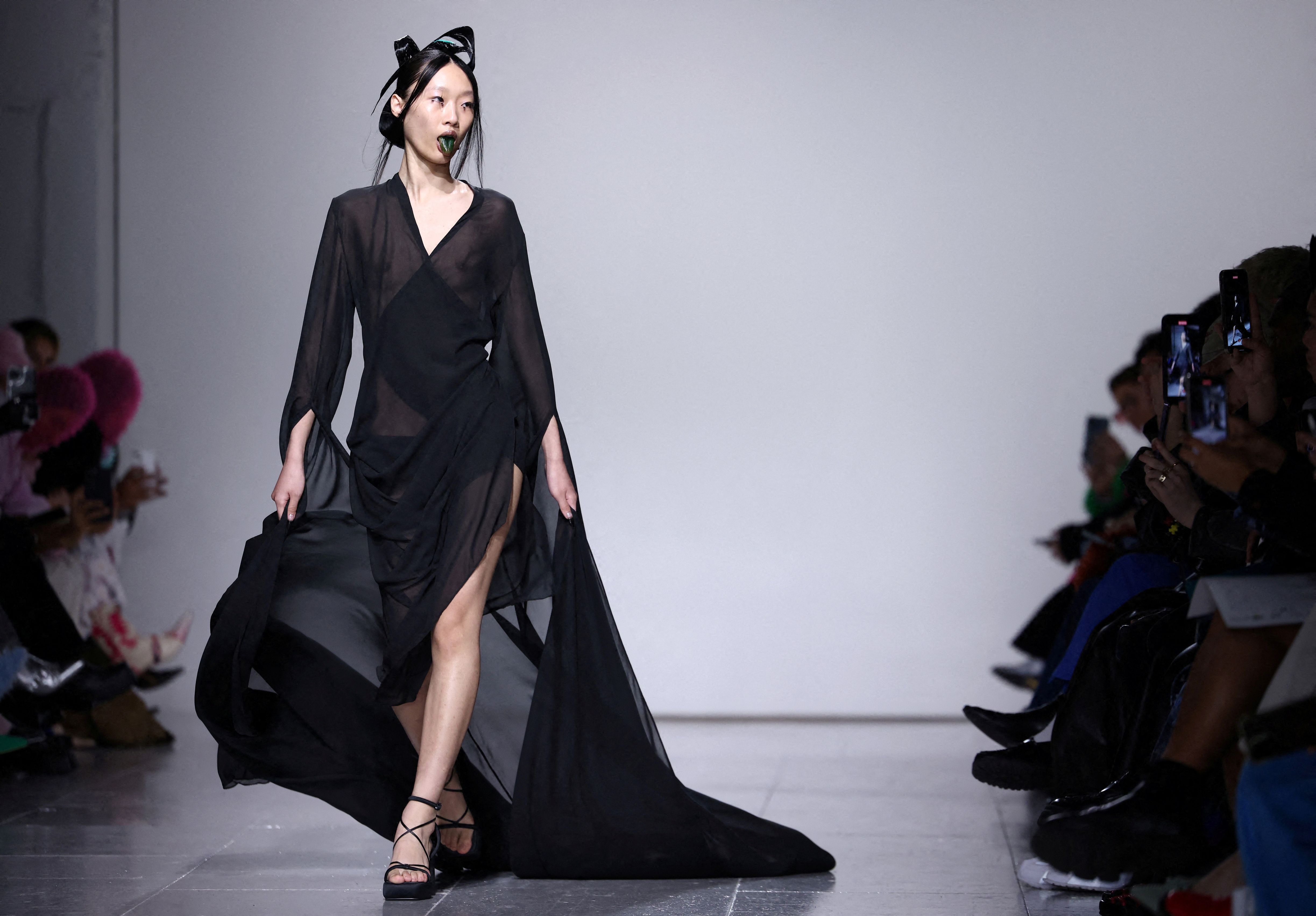 A model presents a creation during the Chet Lo catwalk show during London Fashion Week in London, Britain on February 18, 2023. (Photo by Henry Nicholls/Reuters)