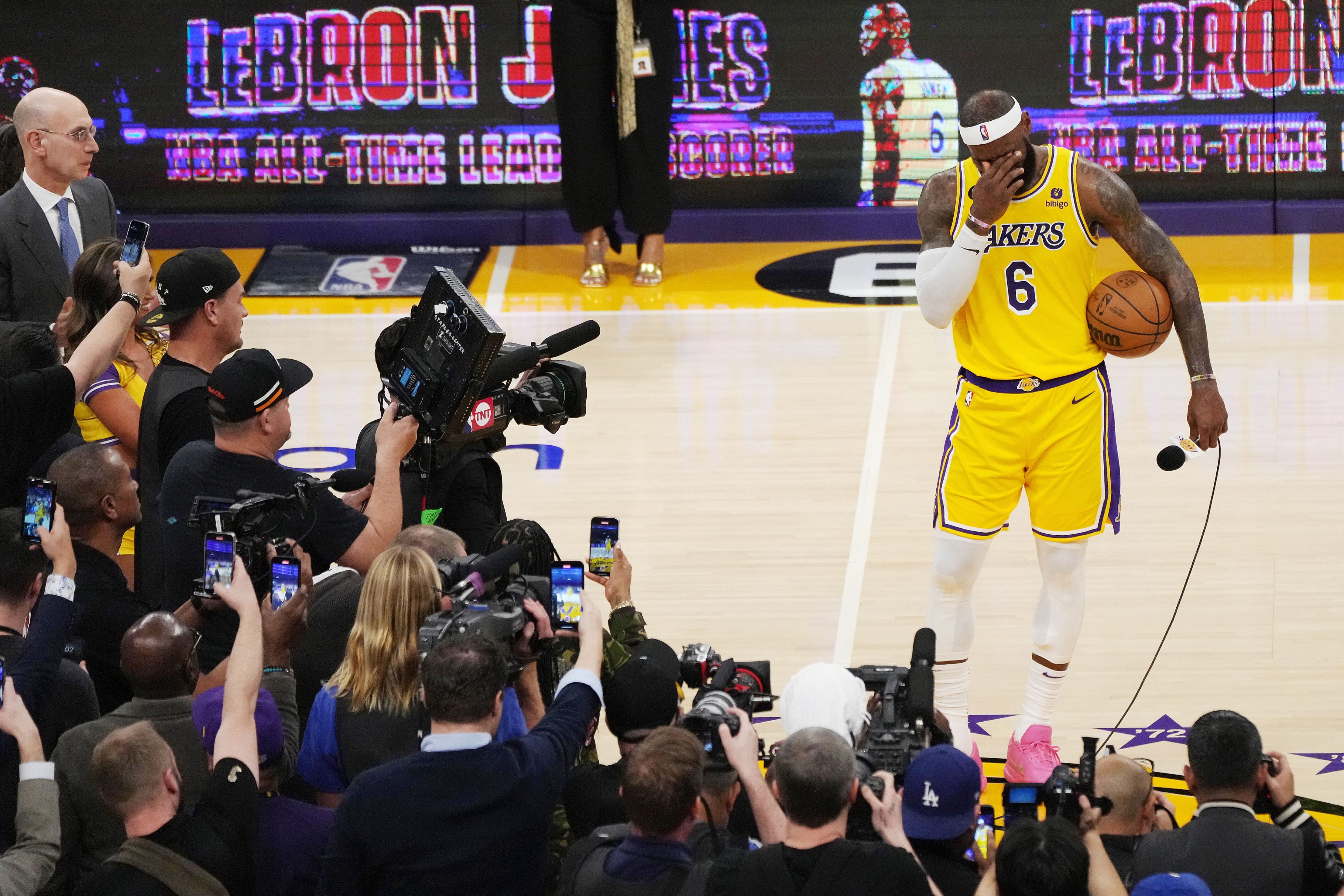 Los Angeles Lakers forward LeBron James (R) stands with his scoring basketball after becoming the all time highest scoring player in NBA history during the second half of the NBA basketball game between the Los Angeles Lakers and Oklahoma City Thunder at the Crypto.com Arena in Los Angeles, California, USA, 07 February 2023. (Photo by Allison Dinner/EPA/EFE)