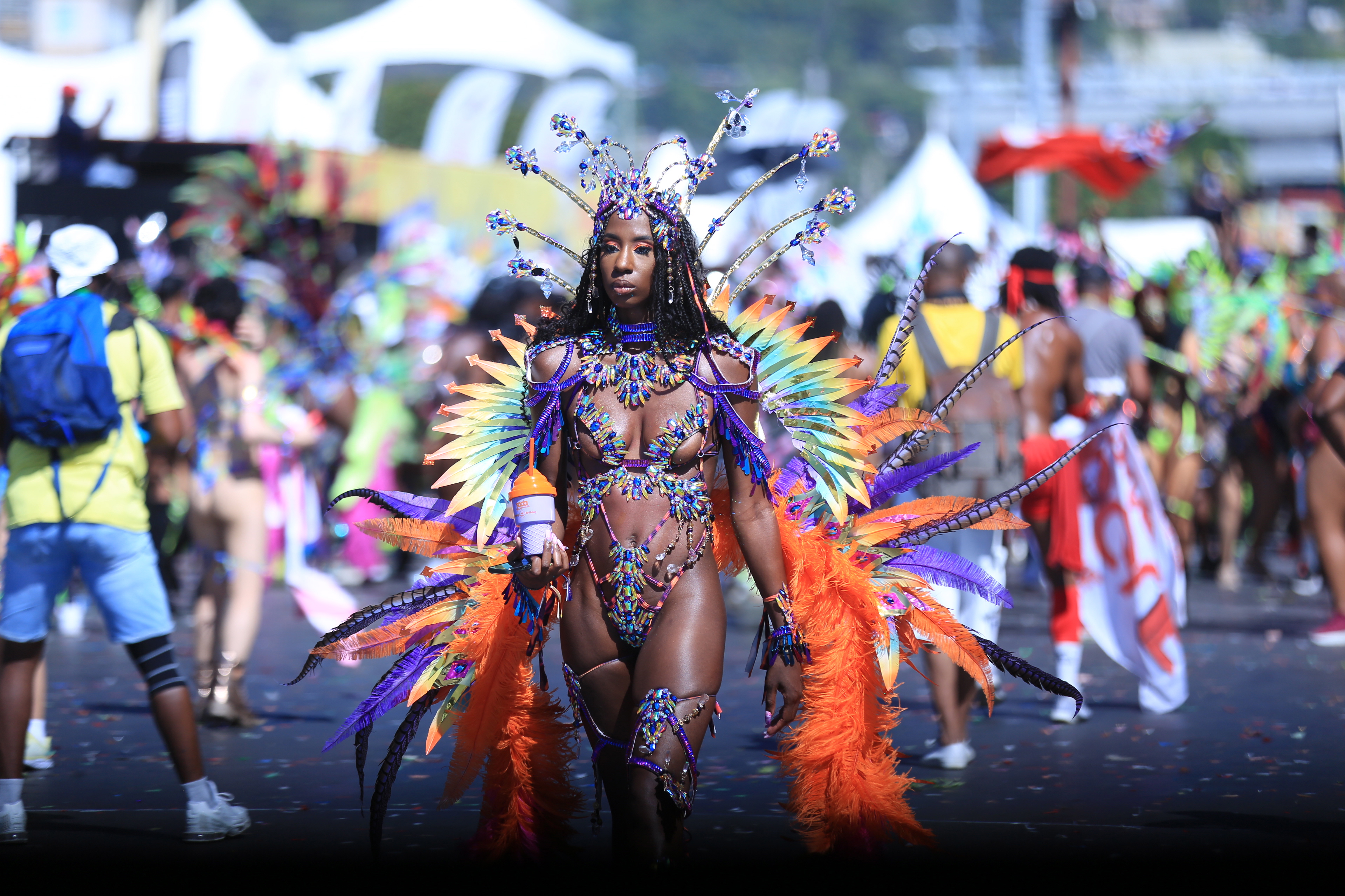 A member of Yuma- Awakened Treasure parades during the last day of the carnival at Queens's park Savannah in Port of Spain, Trinidad and Tobago on February 21, 2023. Trinidad and Tobago celebrated its carnival in style, which is one of the most important in the Caribbean, after a two-year break forced by the Covid-19 pandemic. (Photo by Andrea De Silva/EPA)