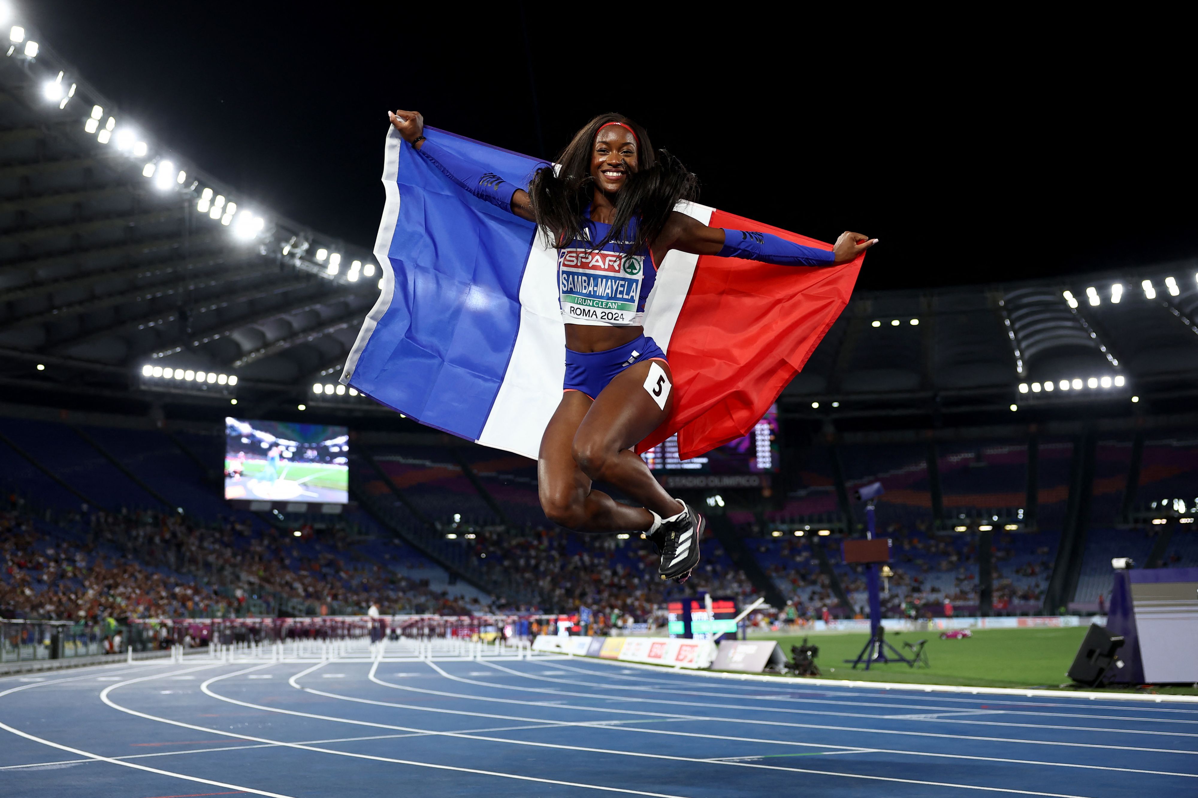 France's athlete Cyrena Samba-Mayela celebrates winning the women's 100m hurdles final during the European Athletics Championships at the Olympic stadium in Rome on June 8, 2024. (Photo by Anne-Christine Poujoulat/AFP Photo)