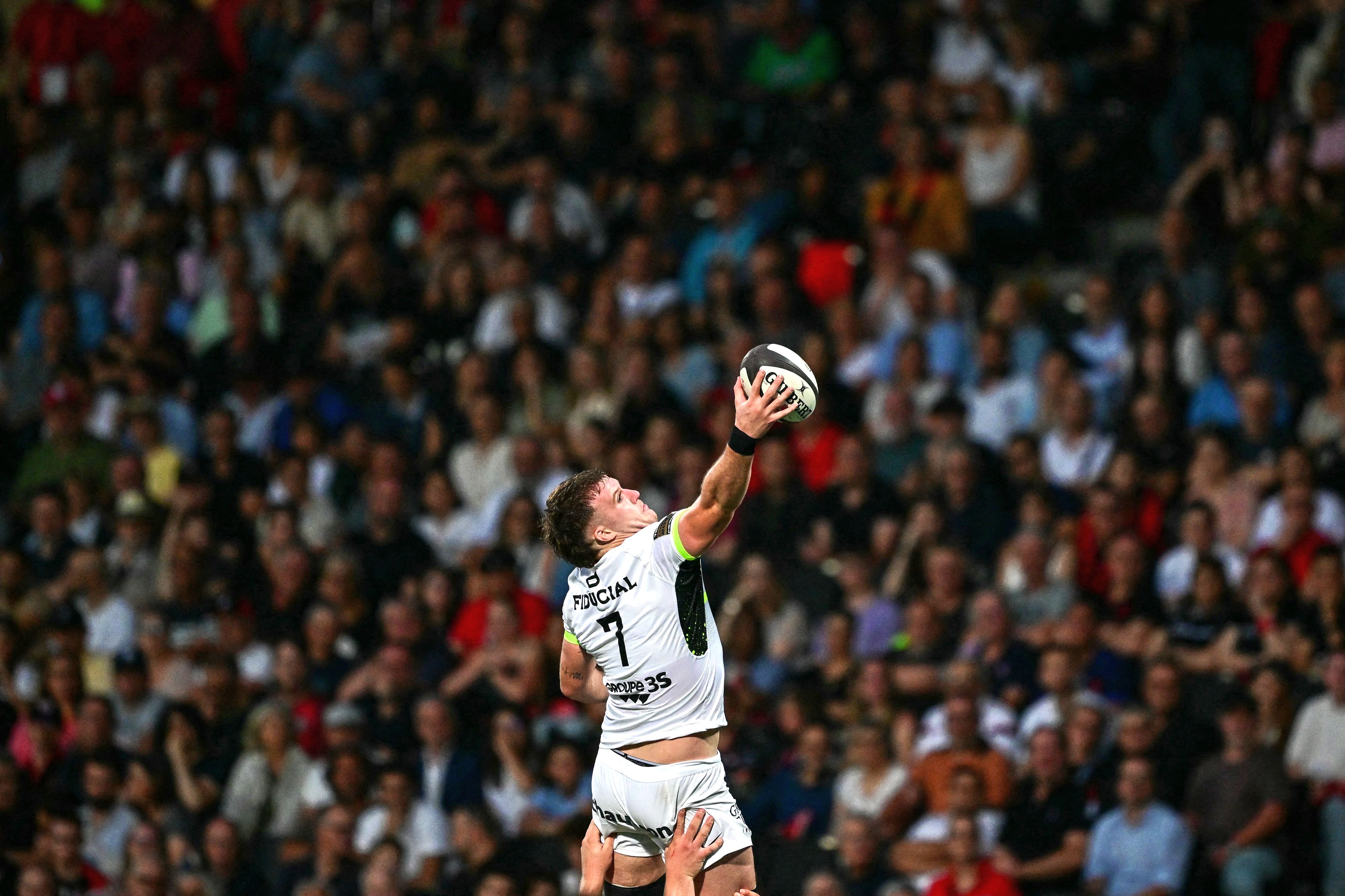 Toulouse's Irish lock Joshua Brennan (C) is lifted into the air to catch the ball from a Toulouse lineout during the French Top14 rugby union match between Lyon Olympique Universitaire Rugby and Stade Toulousain Rugby (Toulouse) at the Gerland Stadium in Lyon, central-eastern France, on June 8, 2024. (Photo by Olivier Chassignole/AFP Photo)