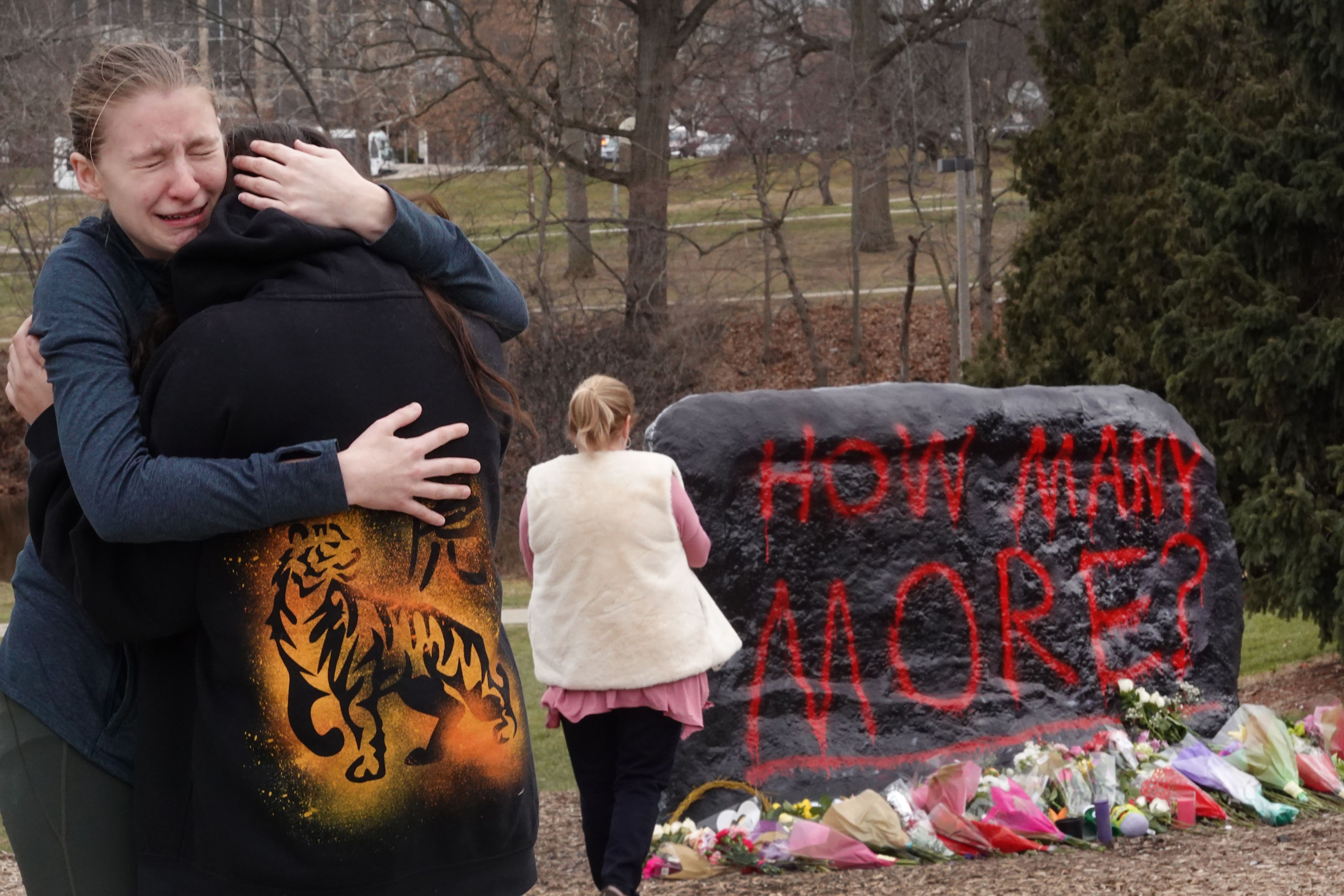 People leave flowers, mourn and pray at a makeshift memorial at “The Rock” on the campus of Michigan State University on February 14, 2023 in East Lansing, Michigan. A gunman opened fire at two locations on the campus last night killing three students and injuring several others. (Photo by Scott Olson/Getty Images)