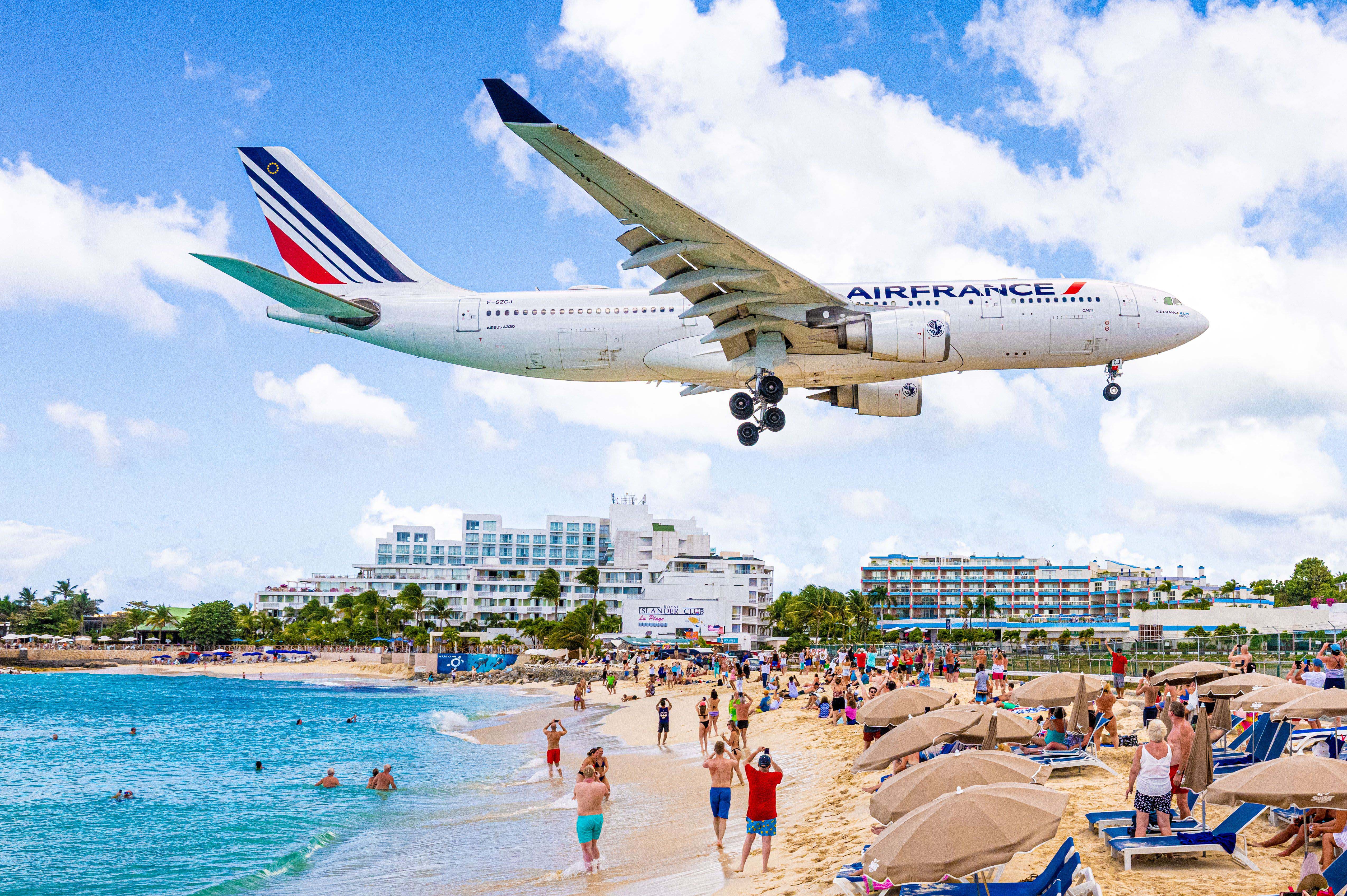 Air France airplane from Air France-KLM Group arriving at Princess Juliana International Airport, Sint Maarten, Dutch Carebbean Island on February 12, 2023, taken from Sunset Beach Bar at Maho Beach, Sint Maarten, known for the beach being very close to the runway. (Photo by Rex Features/Shutterstock)