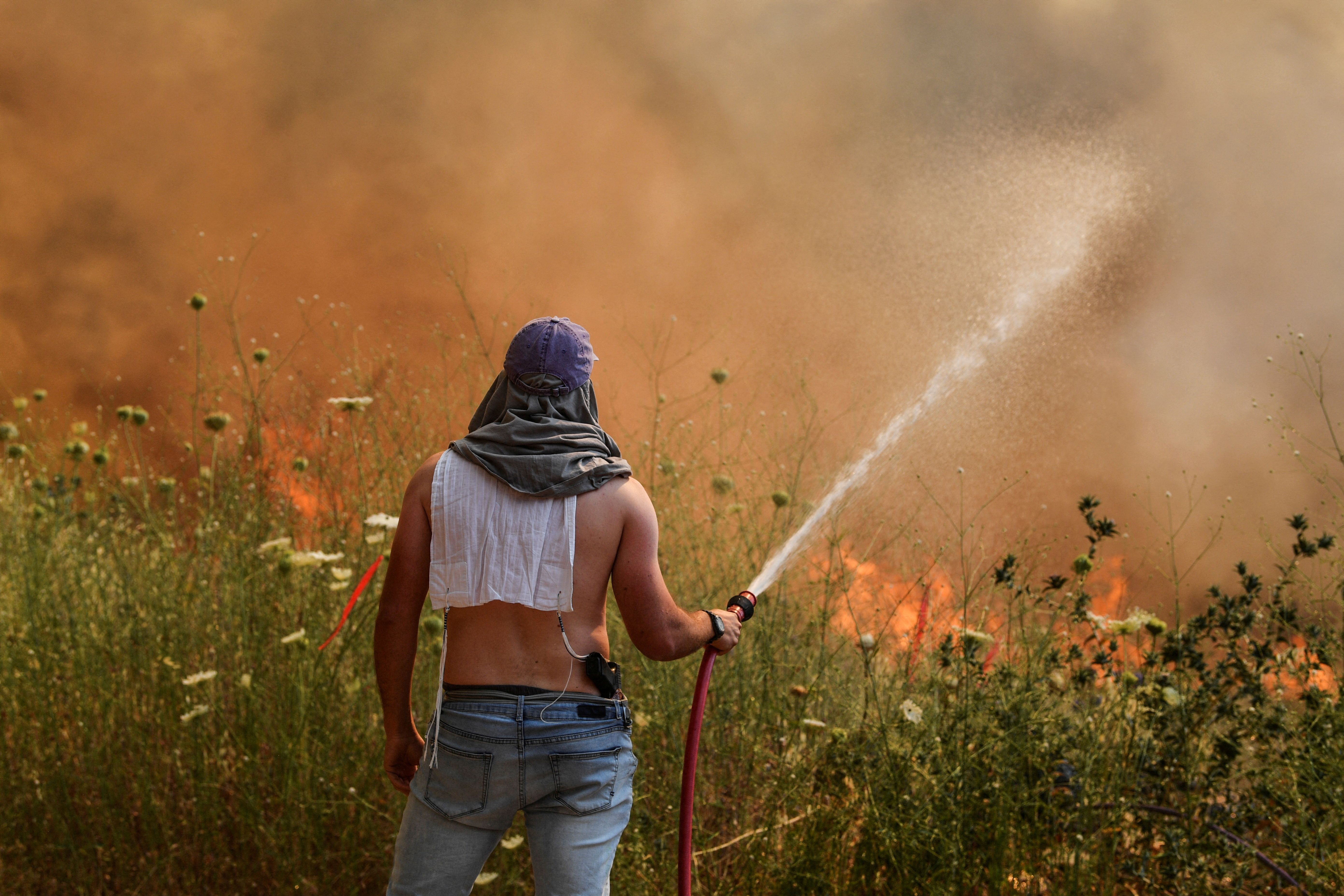 An Israeli man sprays water on fire following rocket attacks from Lebanon, amid ongoing cross-border hostilities between Hezbollah and Israeli forces, in Katzrin in the Israeli-occupied Golan Heights, on June 2, 2024. (Photo by Gil Eliyahu/Reuters)
