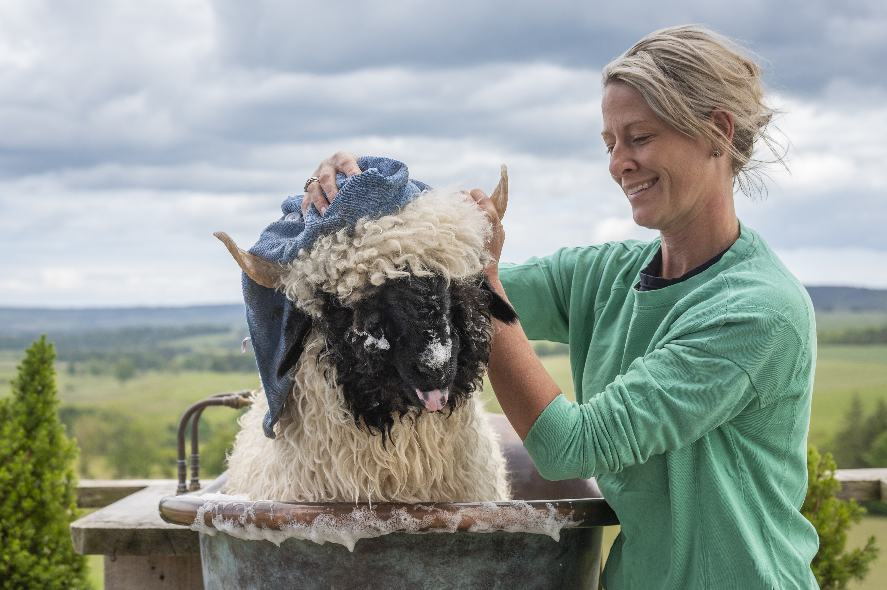 Kitty, a sheep from a Northumberland flock of a Swiss breed, Valais Blacknose, enjoys a bath before the Royal Highland Show at Ingliston near Edinburgh in the second decade of June 2024. (Photo by Phil Wilkinson/The Times)