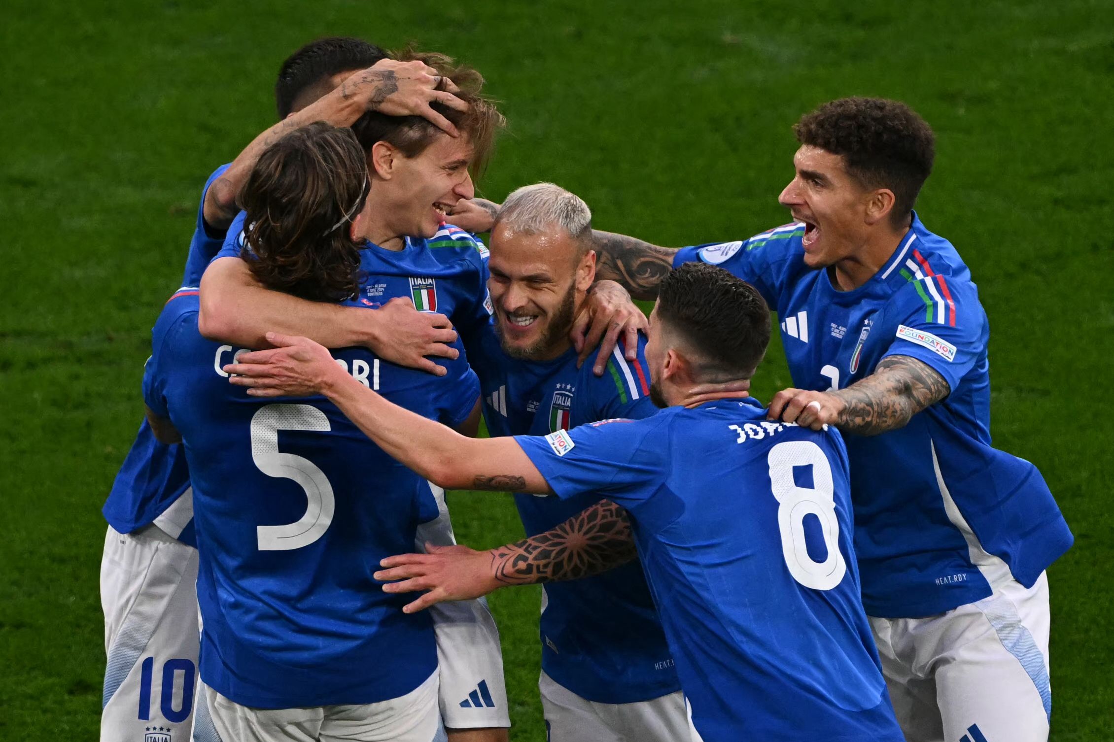 Italy's midfielder #18 Nicolo Barella (2nd-L) celebrates with teammates after scoring his team's second goal during the UEFA Euro 2024 Group B football match between Italy and Albania at the BVB Stadion in Dortmund on June 15, 2024. (Photo by Ozan Kose/AFP Photo)