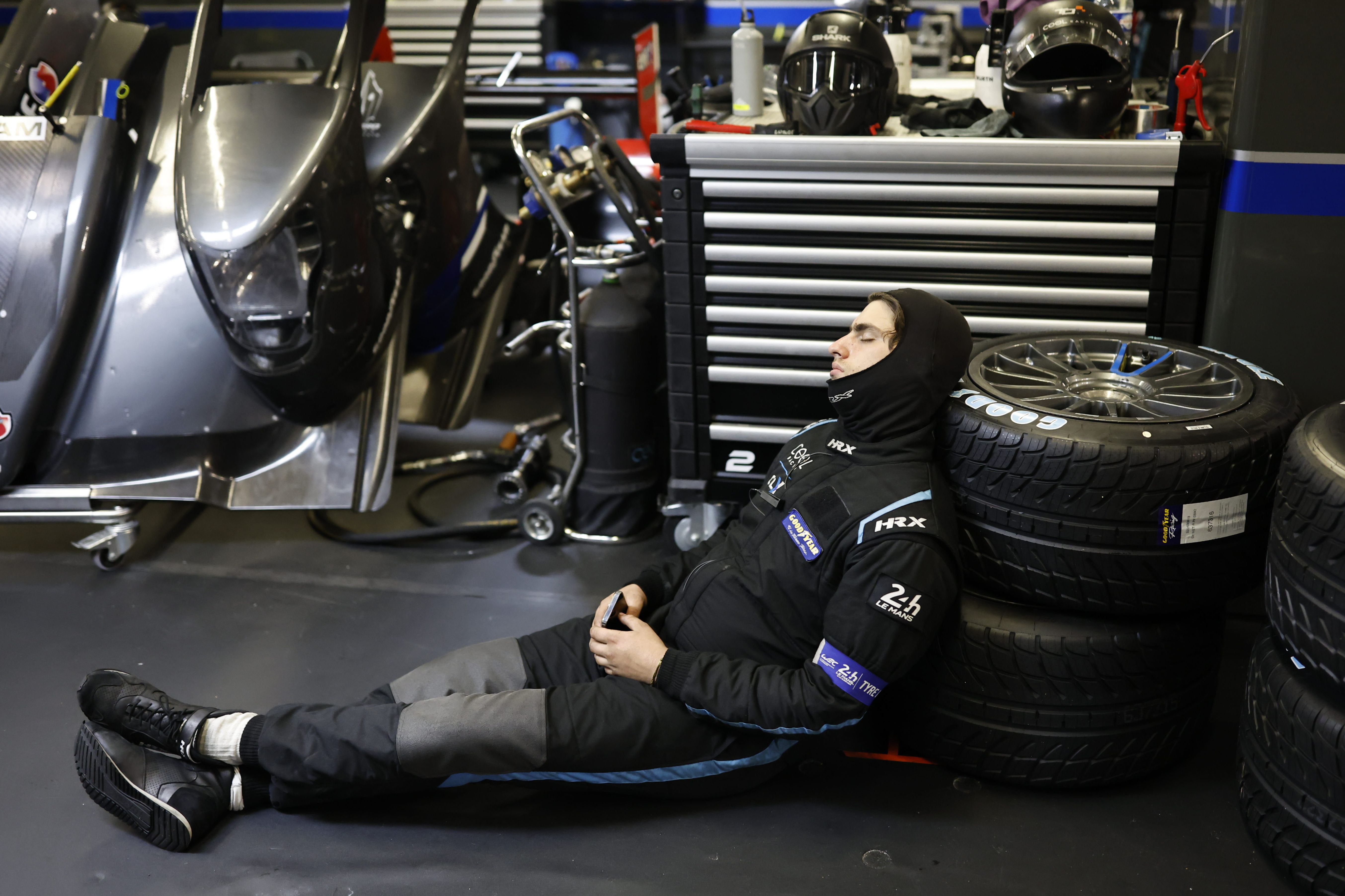 A mechanic sleeps in the paddock during the 24 Hours of Le Mans sports-car race Sunday, June 16, 2024, in Le Mans, France. (Photo by Jeremias Gonzalez/AP Photo)