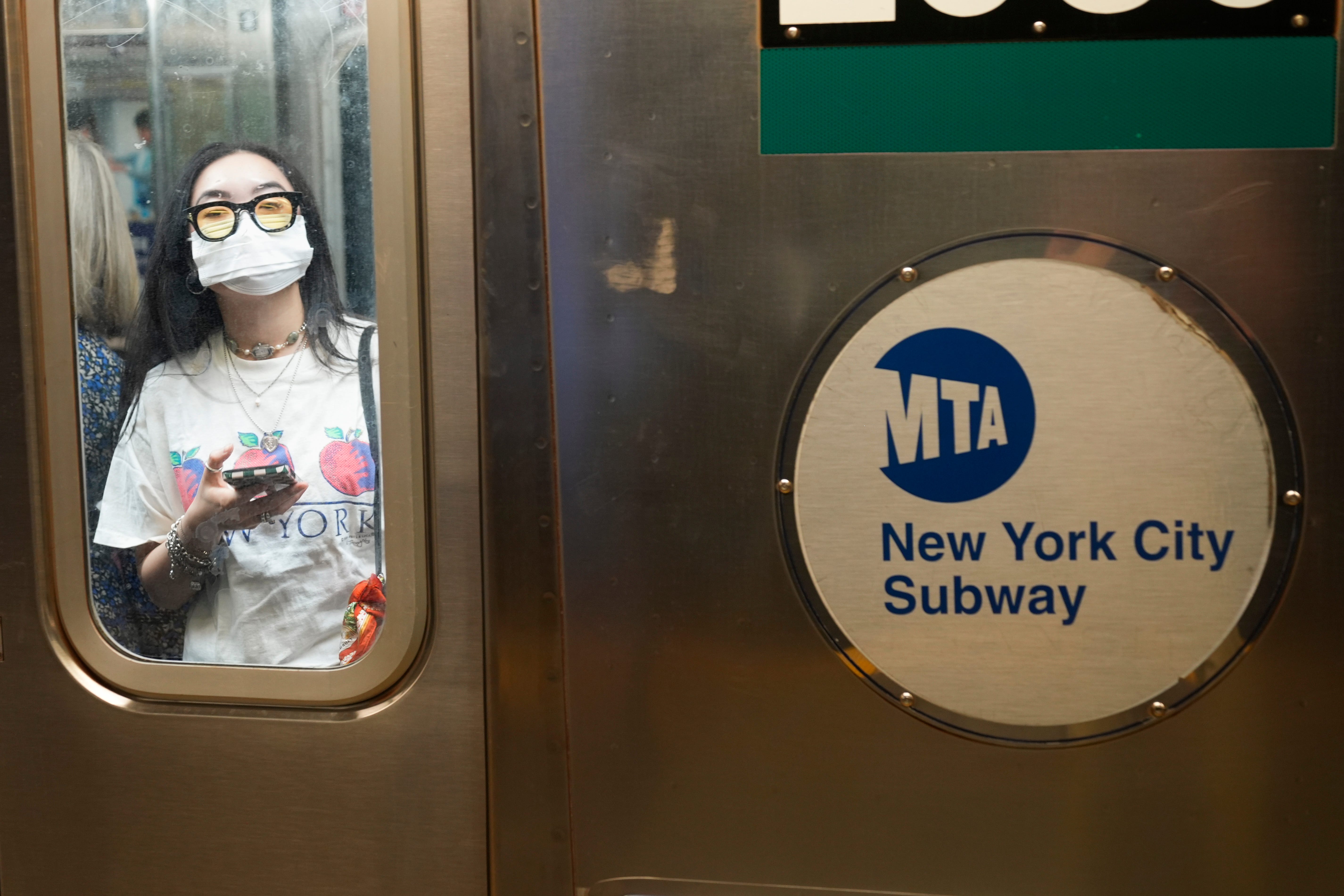 Commuters, one wearing a mask, ride the subway in New York, Friday, June 14, 2024. New York Gov. Kathy Hochul says she is considering a ban on face masks in the New York City subway system, following what she described as concerns over people shielding their identities while committing antisemitic acts. (Photo by Seth Wenig/AP Photo)