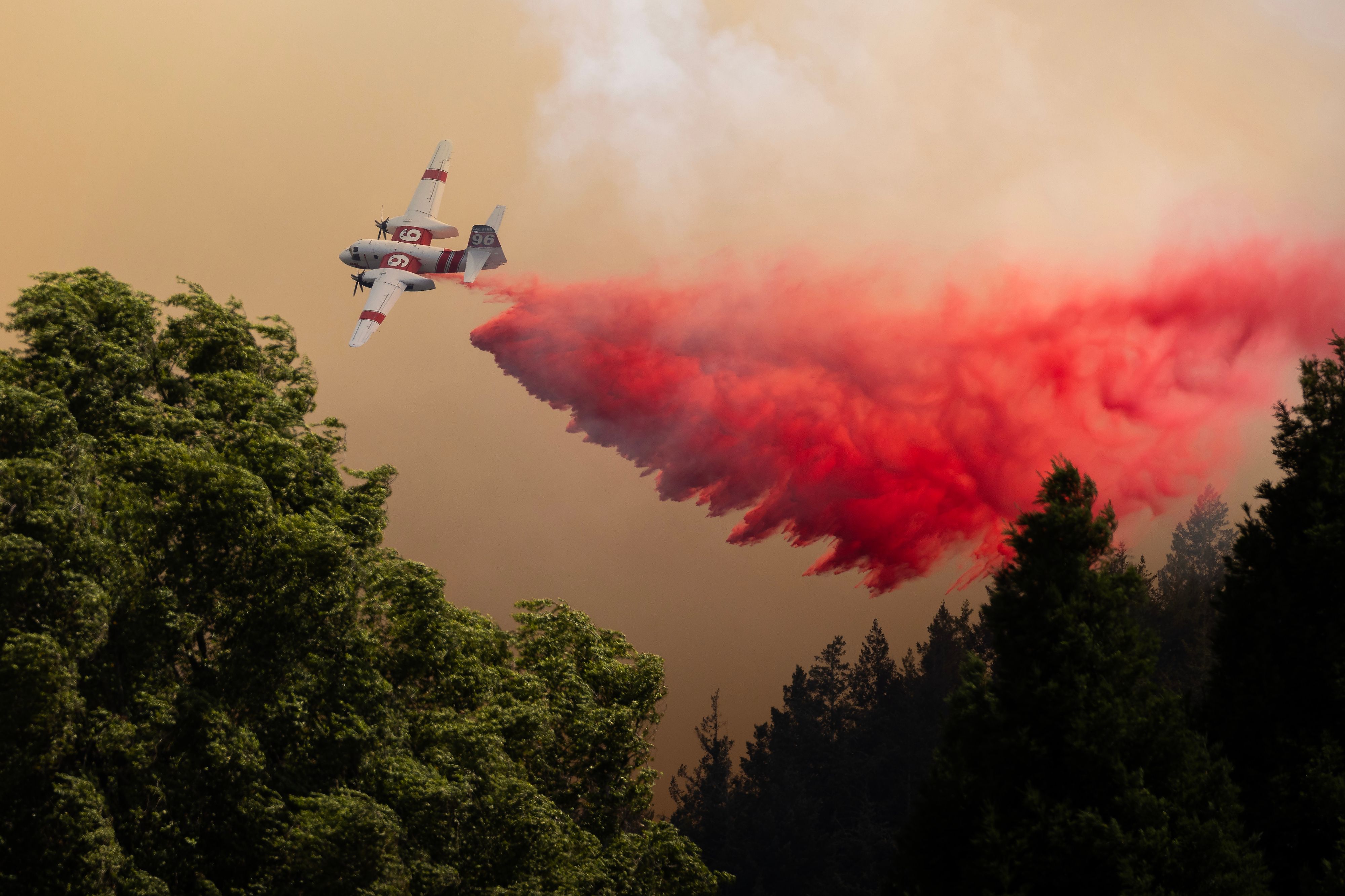 A plane drops retardant ahead of the Point Fire, west of Geyserville, California on Sunday, June 16, 2024. Fast-moving wildfires, pushed by high winds, hit dry landscapes forcing evacuations as California enters the fire season. (Photo by Peter DaSilva/UPI/Rex Features/Shutterstock)