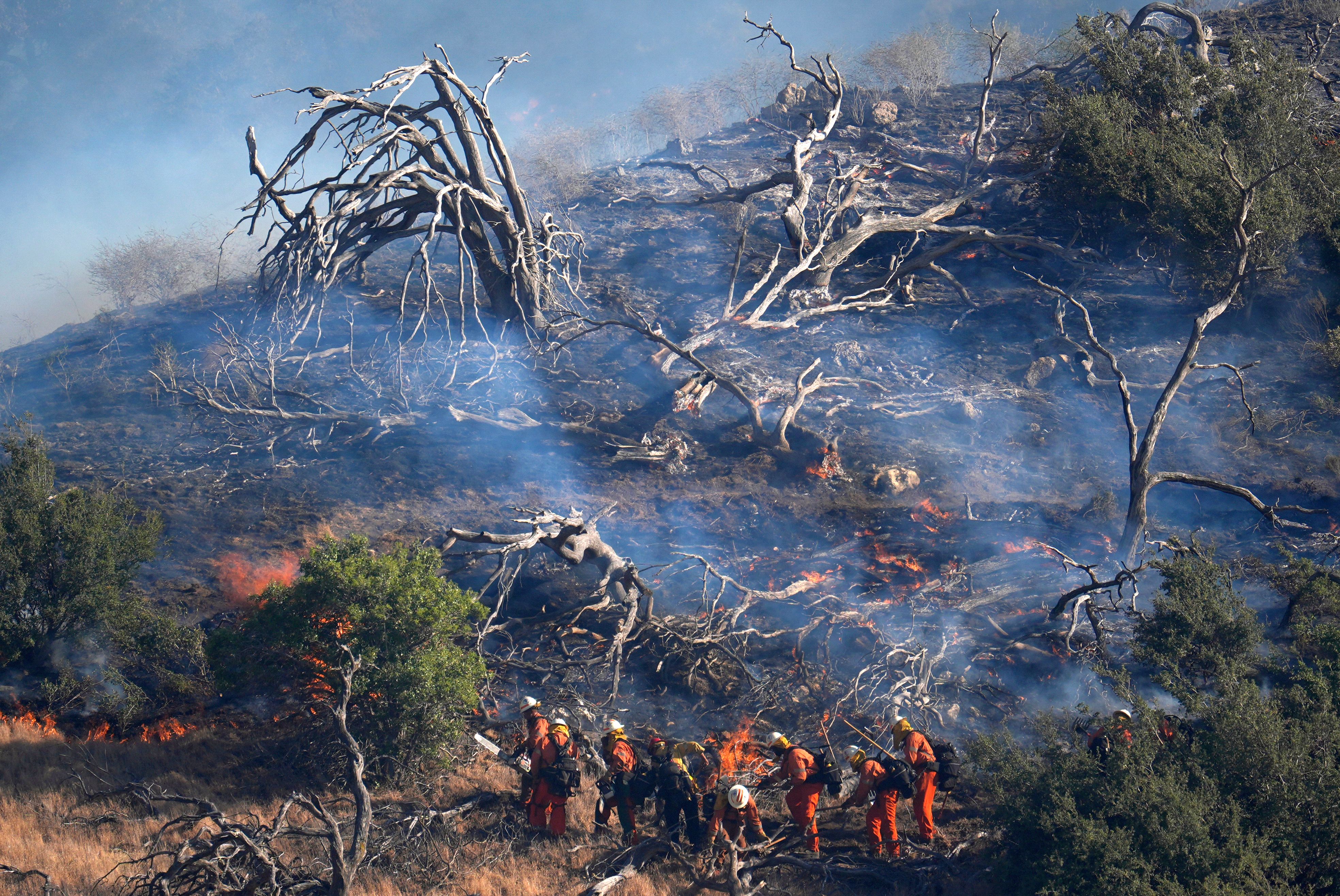 Firefighters work under a smoldering hillside left behind by the Post Fire Saturday, June 15, 2024, in Gorman, Calif. (Photo by Marcio Jose Sanchez/AP Photo)