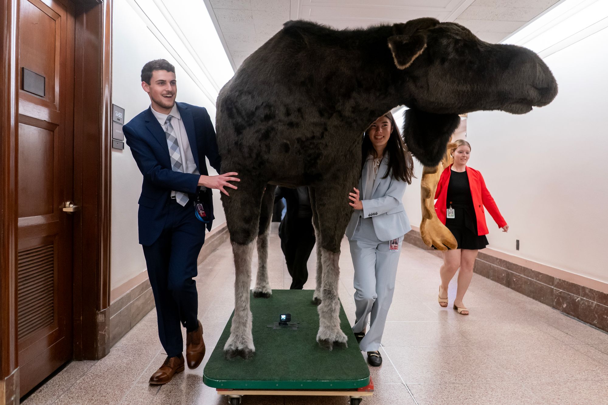 Staff members for U.S. Sen. Jeanne Shaheen (D-NH) push a stuffed moose into their office on Capitol Hill on June 11, 2024 in Washington, DC. A stuffed moose named “Marty the Moose” and a stuffed bear named “Kodak the Bear” will be on display in Shaheen's office as part of the thirteenth annual Experience New Hampshire event. (Photo by Andrew Harnik/Getty Images)