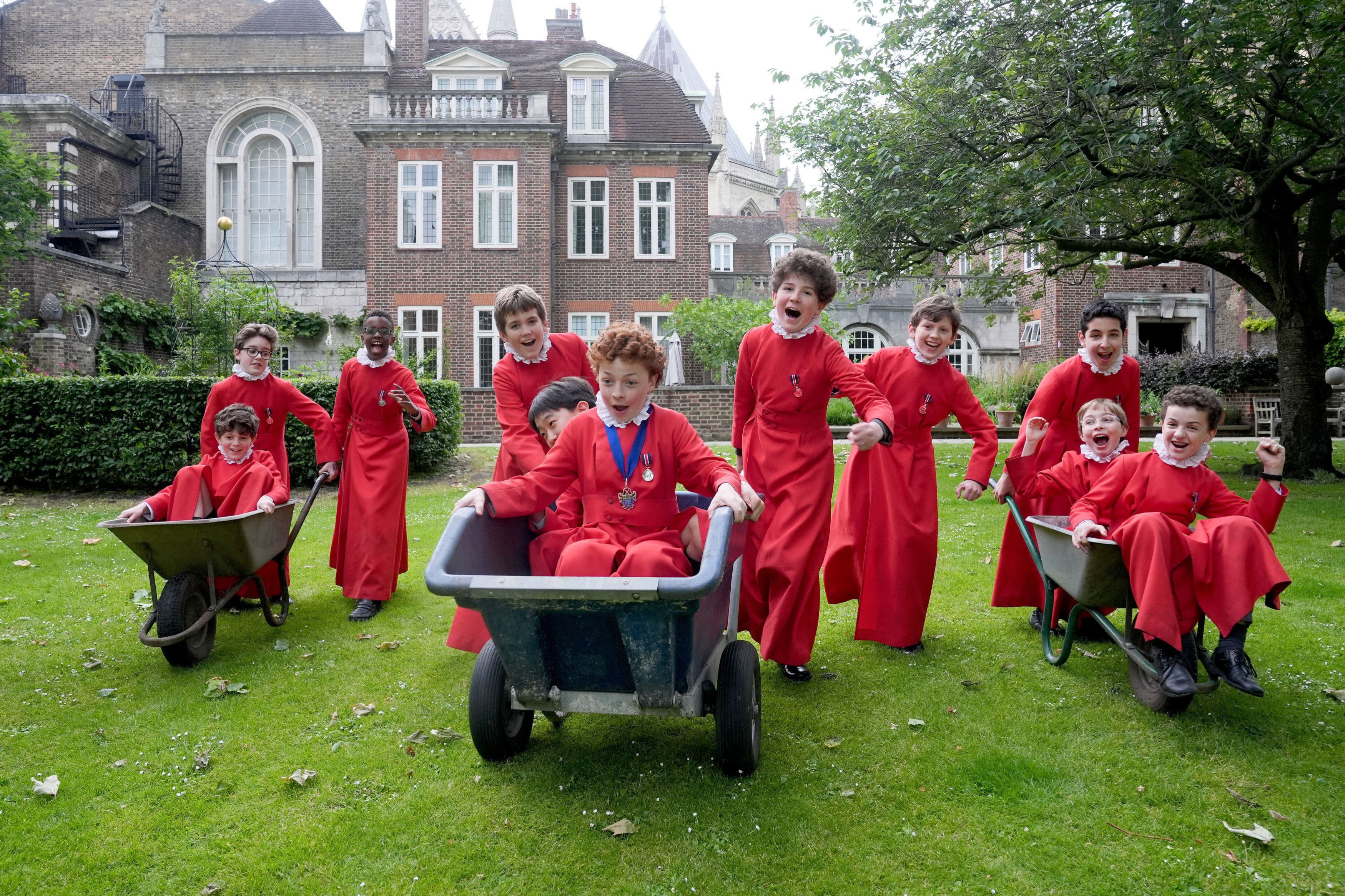 Westminster Abbey choristers, taking a break from rehearsals ahead of their upcoming performance of Haydn's Creation, take part in wheelbarrow races in the Abbey's 900-year-old College Garden on Tuesday, June 11, 2024. (Photo by Lucy North/PA Images via Getty Images)