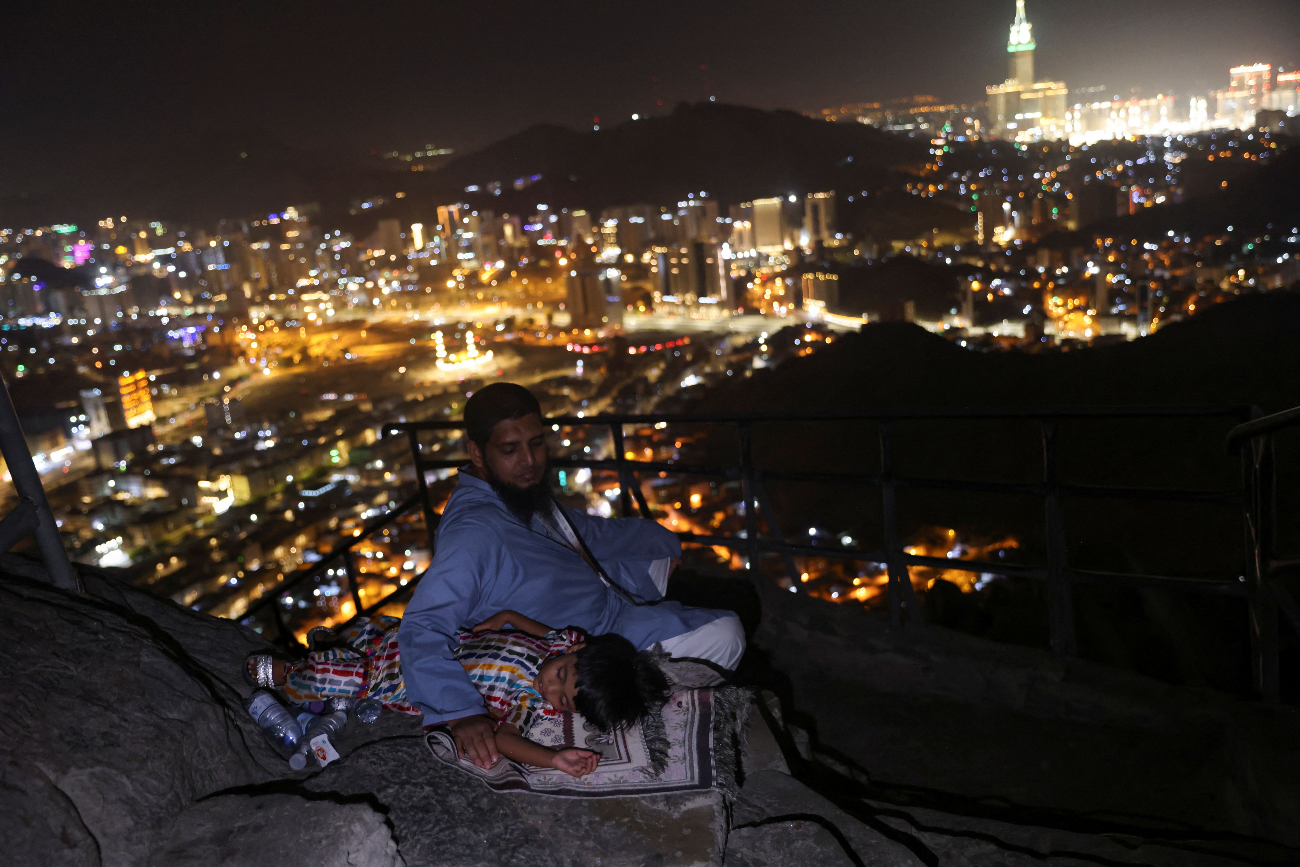 A Muslim pilgrim sits with a child at Mount Al-Noor, where Muslims believe Prophet Mohammad received the first words of the Koran through Gabriel in the Hira cave, ahead of the annual haj pilgrimage, in the holy city of Mecca, SSaudi Arabia, on June 11, 2024. (Photo by Saleh Salem/Reuters)