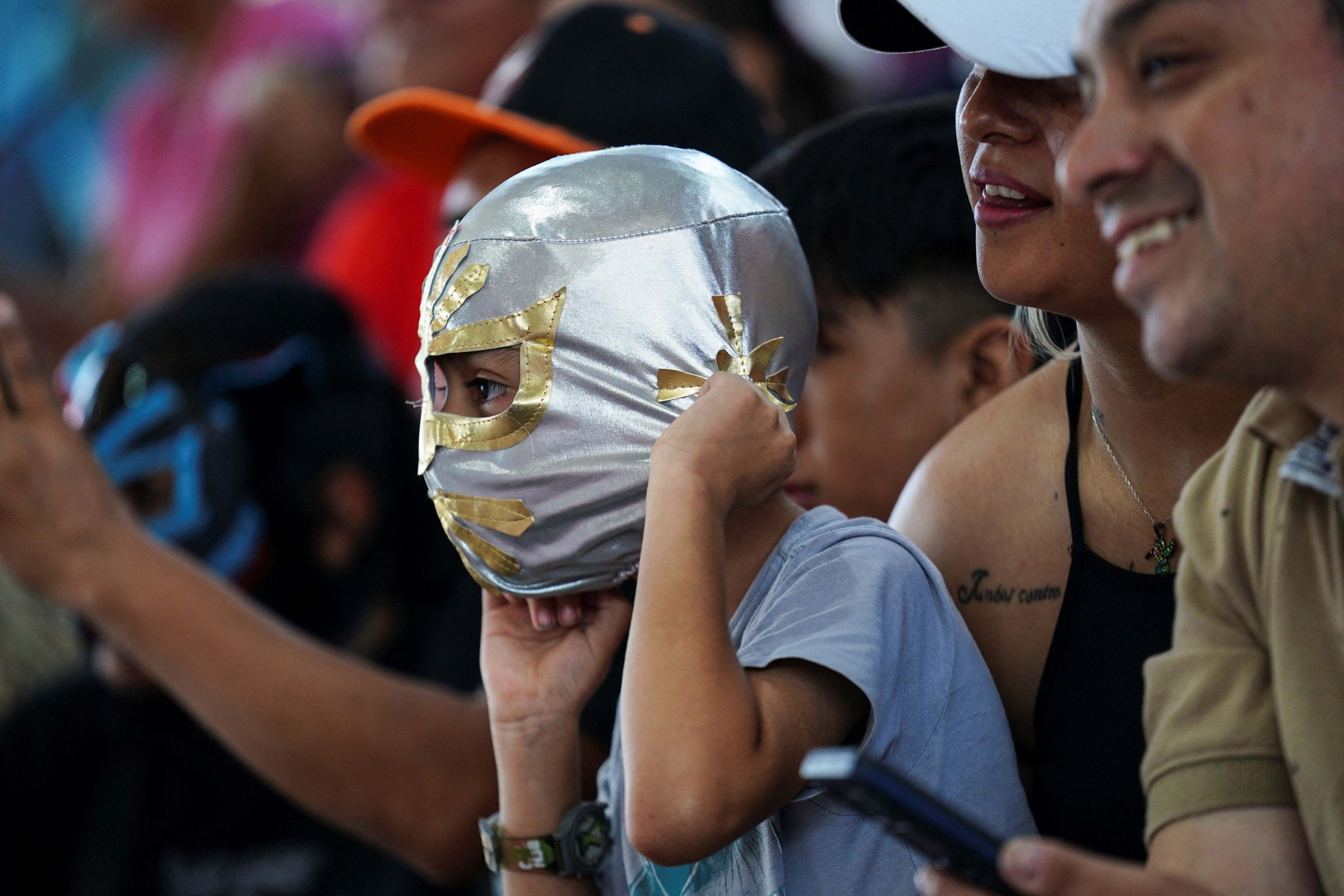 A boy wears a “Lucha Libre” mask as wrestlers engage in a “Lucha Libre” performance to raise awareness for climate change in the Iztapalapa neighborhood in Mexico City, Mexico, on June 8, 2024. (Photo by Toya Sarno Jordan/Reuters)