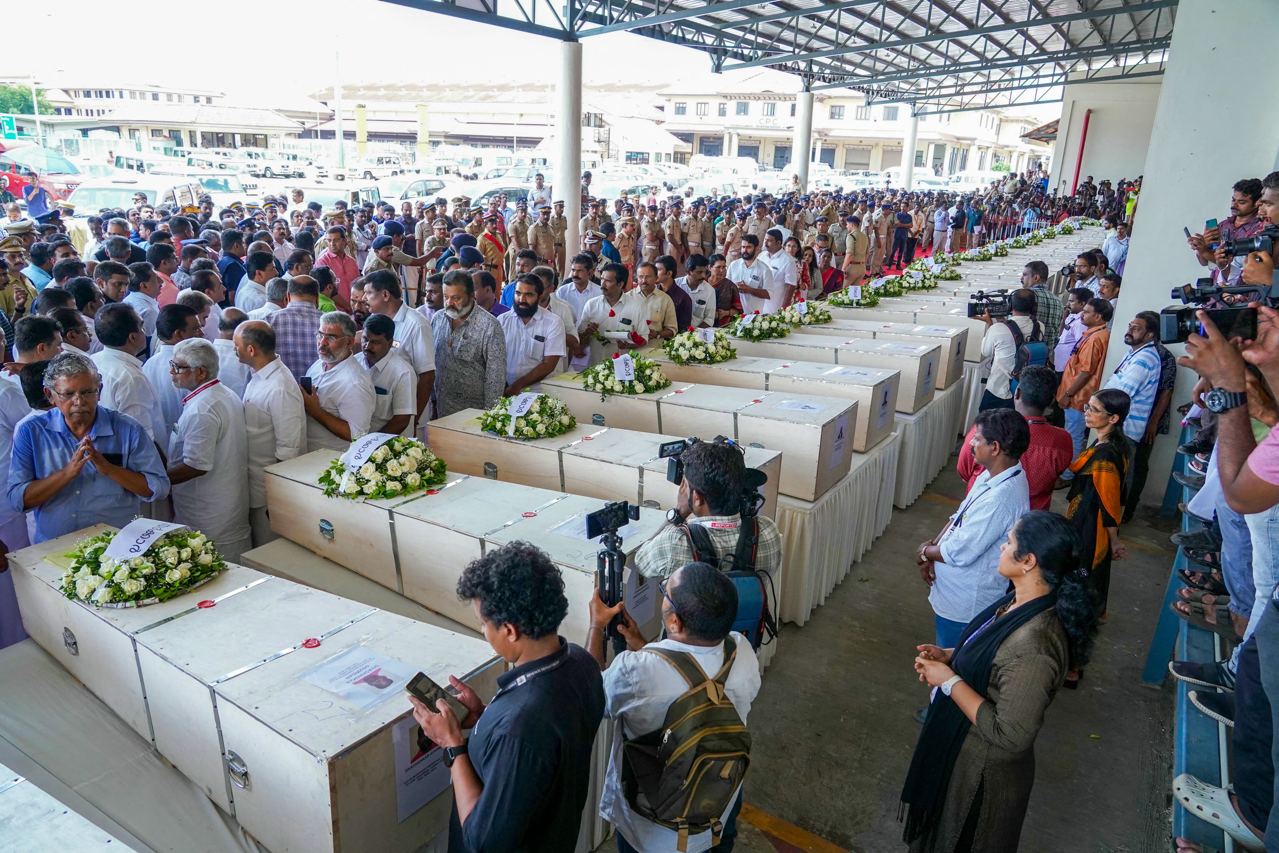 Relatives mourn near the deceased after the coffins' arrival on an Indian Air Force plane from Kuwait at the Cochin International Airport in Kochi on June 14, 2024. Grieving families kept a solemn vigil in the terminal of an Indian airport on June 14 as the bodies of dozens of migrant workers killed in a Kuwait building fire returned home. Wednesday's dawn blaze quickly engulfed a housing block home to some of the many foreign labourers servicing the oil-rich gulf state's economy. (Photo by Arun Chandrabose/AFP Photo)