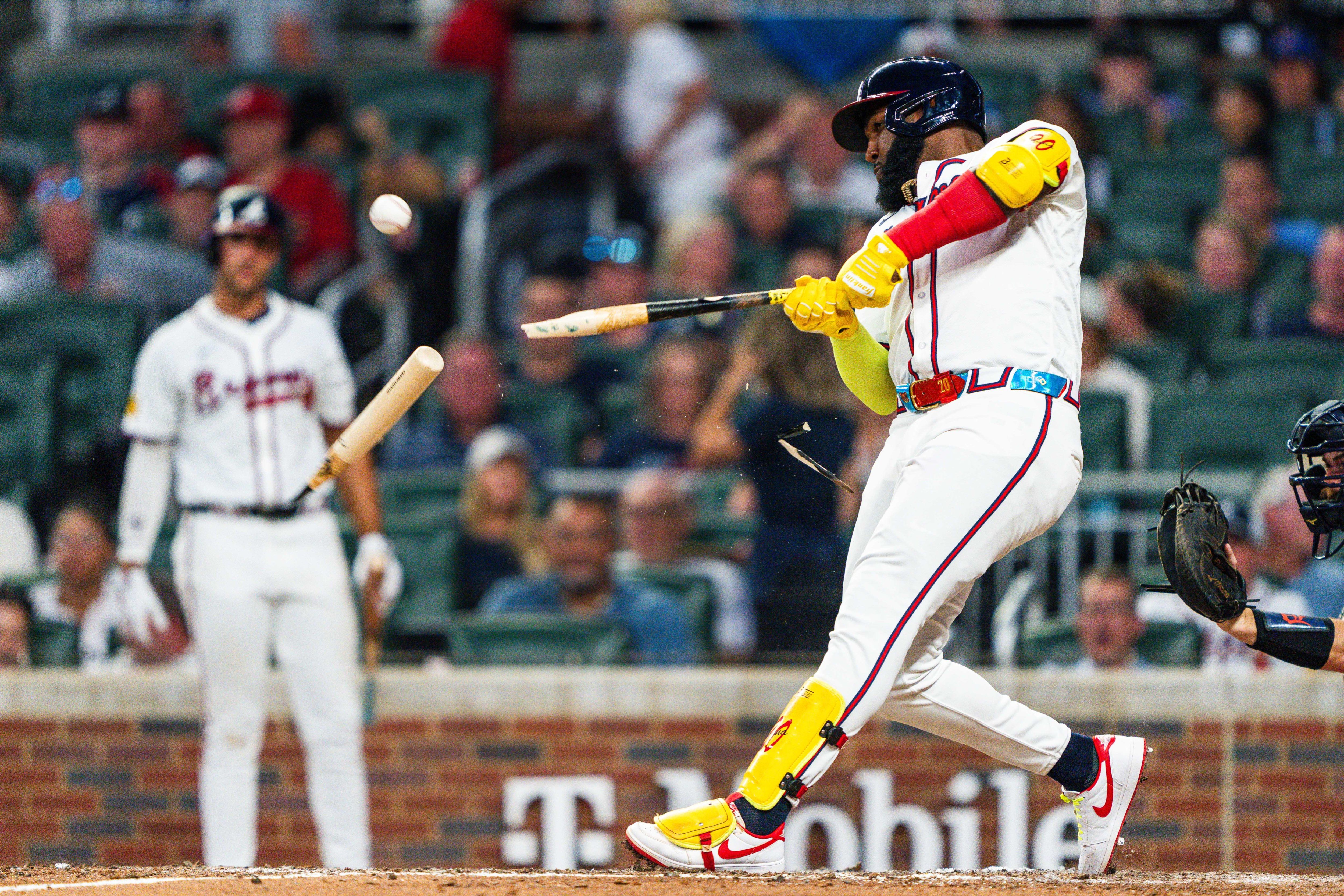 Marcell Ozuna #20 of the Atlanta Braves breaks his bat in the sixth inning against the Detroit Tigers at Truist Park on June 17, 2024 in Atlanta, Georgia. (Photo by Matthew Grimes Jr./Atlanta Braves/Getty Images)
