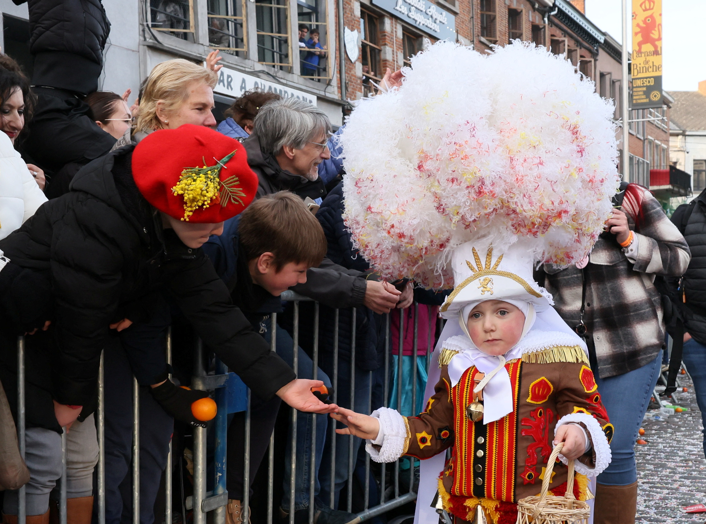 A child wearing a “Gilles” costume holds a basket of oranges while taking part in the Binche carnival, a UNESCO World Heritage event, in Binche, Belgium on February 21, 2023. (Photo by Yves Herman/Reuters)