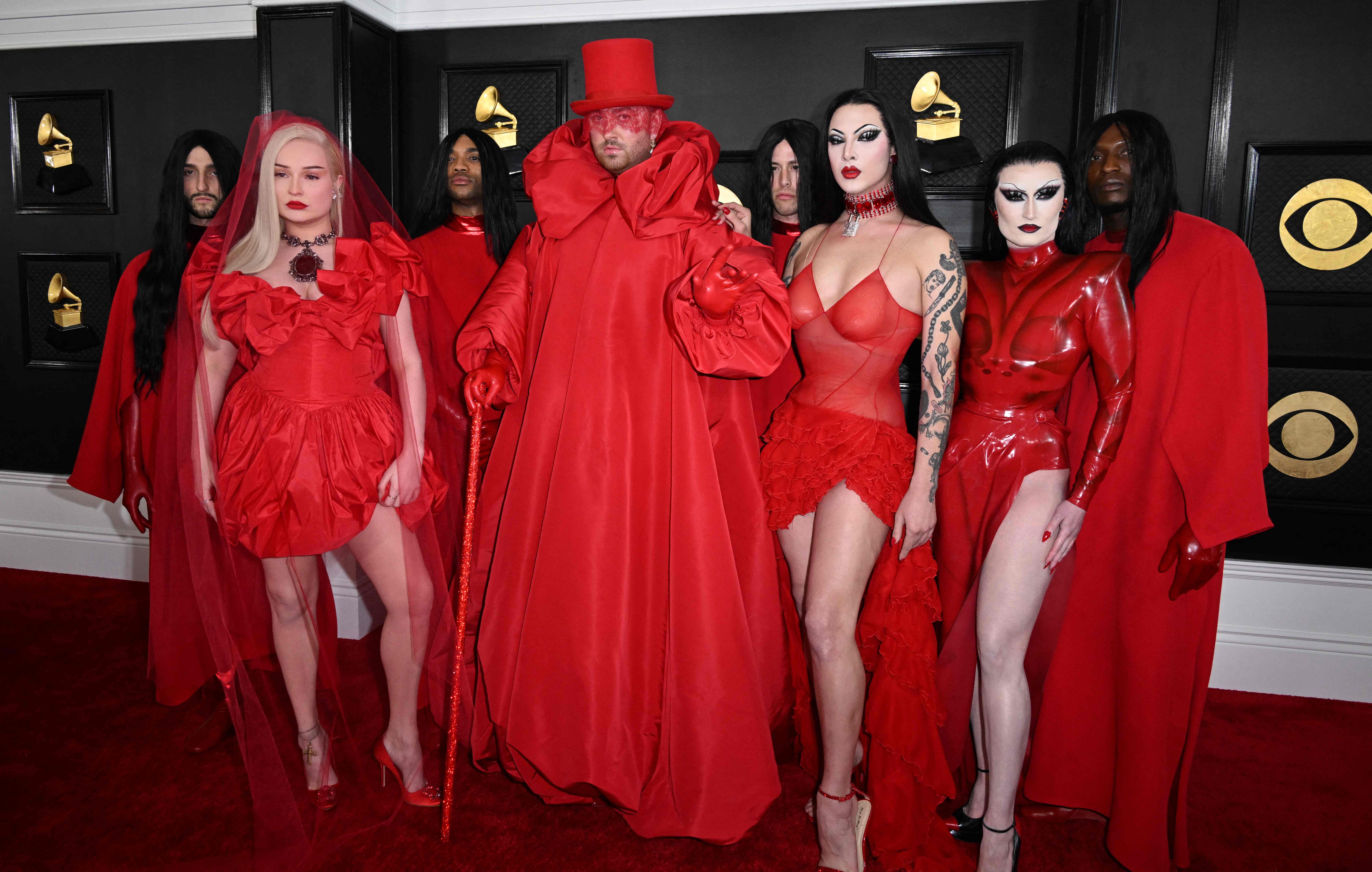 English singer-songwriter Sam Smith (C) arrives for the 65th Annual Grammy Awards at the Crypto.com Arena in Los Angeles on February 5, 2023. (Photo by Robyn Beck/AFP Photo)