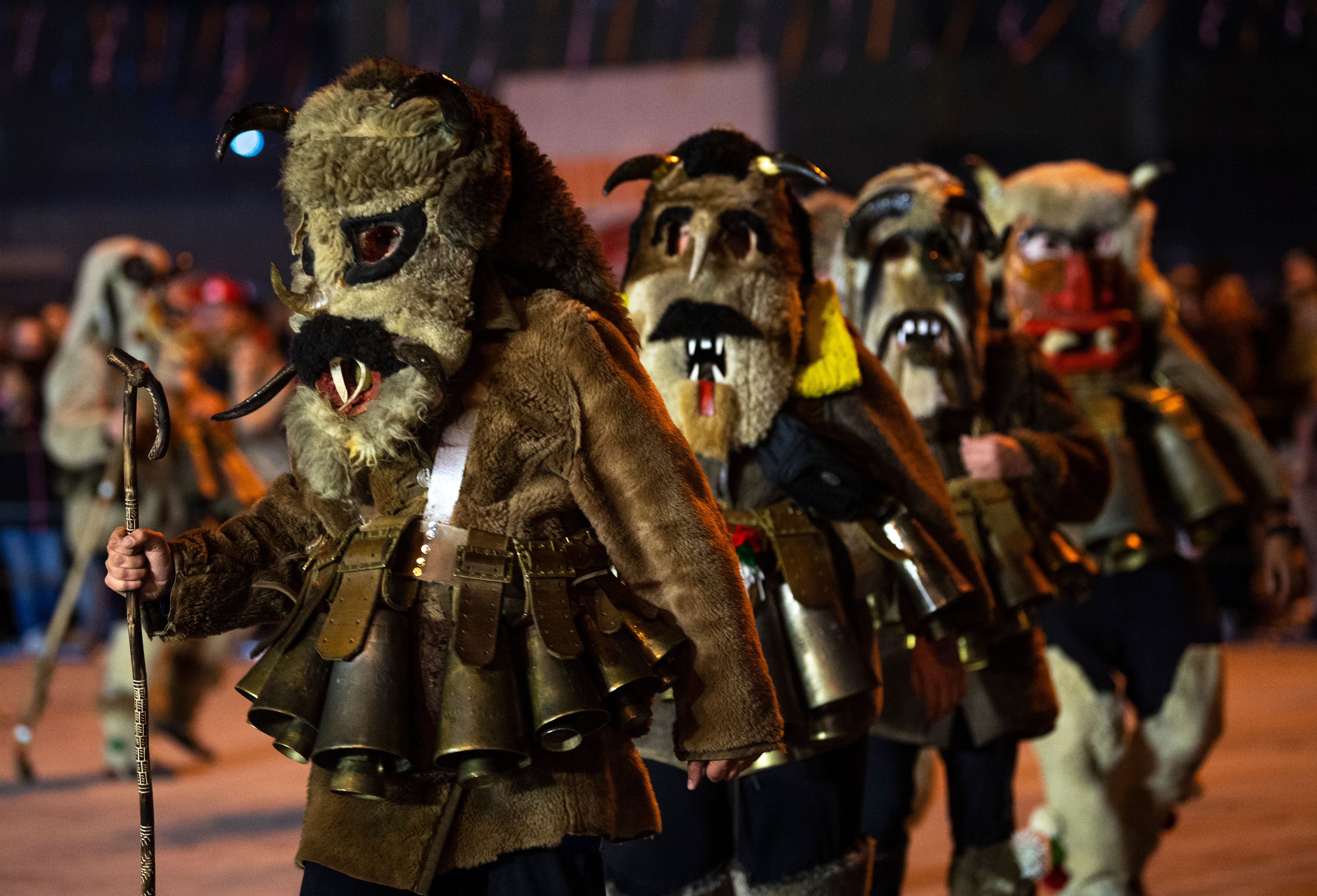 Members of carnival groups perform during a carnival procession of the closing carnival night in the town of Strumica, southeastern North Macedonia, 25 February 2023. North Macedonians are marking Trimery, an Orthodox Christian holiday, when evil spirits are chased away with dance rituals. The holiday marks the beginning of the fasting period ahead of Easter. (Photo by Georgi Licovski/EPA/EFE/Rex Features/Shutterstock)