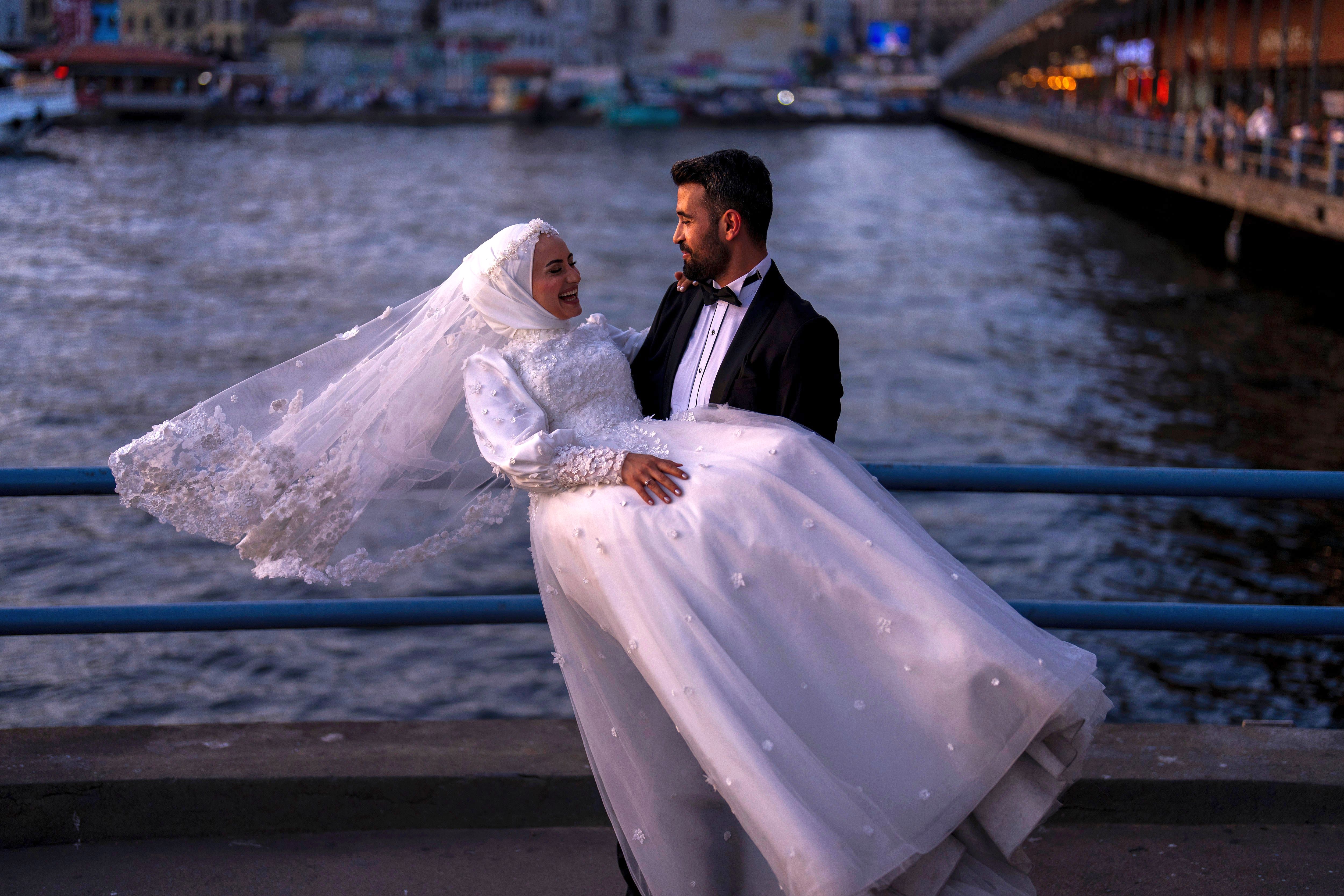 A young couple pose during a photo session at Galata bridge in Istanbul, Turkey, Monday, June 3, 2024. The landmark is a popular location for photograph sessions of couples who are about to or just married. (Photo by Francisco Seco/AP Photo)
