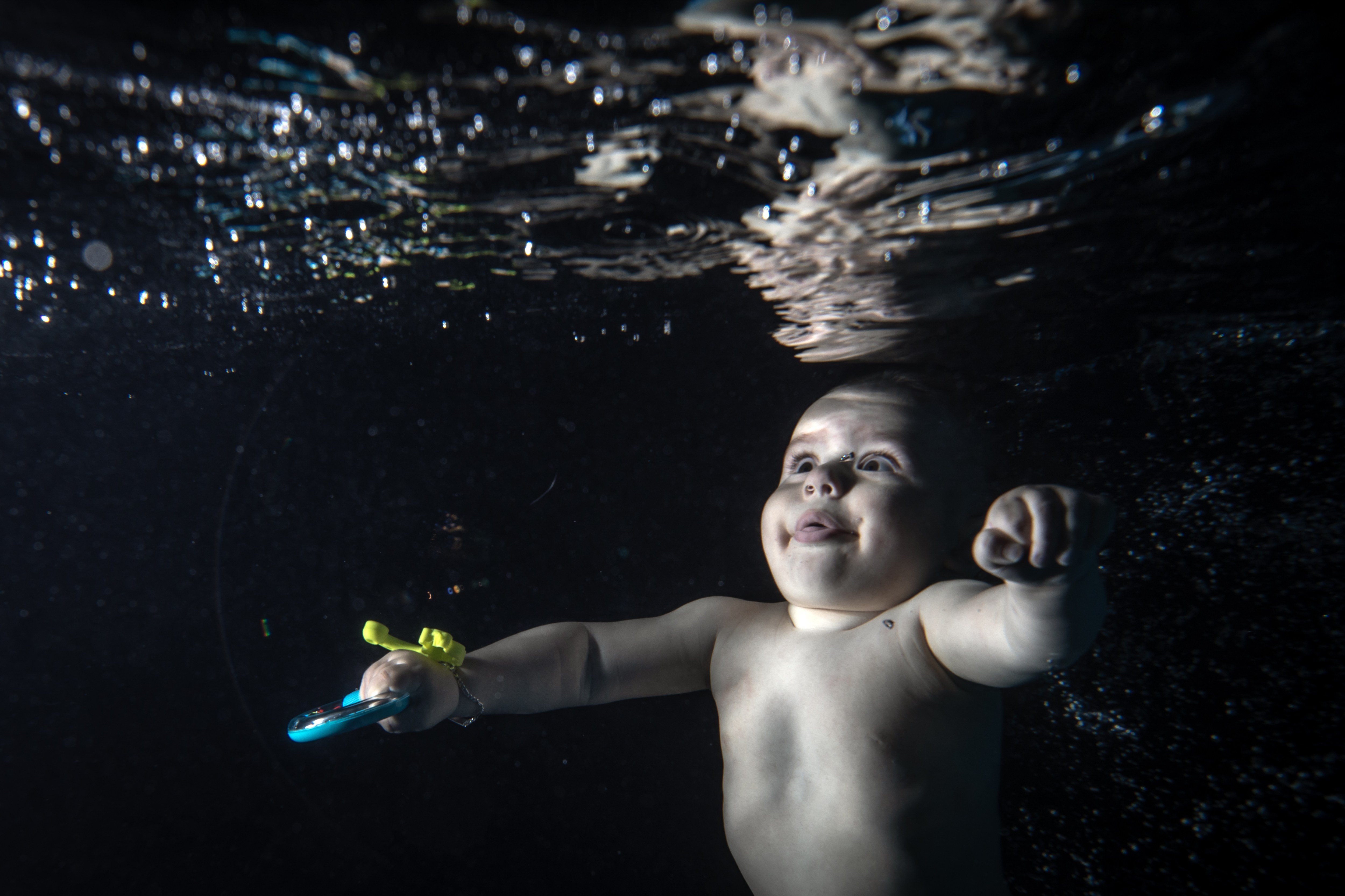 A baby, receiving swimming and diving training, is seen underwater in Istanbul, Turkiye on June 6, 2024. In addition to those with normal development, babies with various muscle disorders are given swimming and diving lessons starting at two months old. These lessons, believed to benefit babies' perceptual abilities, intelligence, balance, and coordination, aim to accelerate their development. (Photo by Sebnem Coskun/Anadolu via Getty Images)