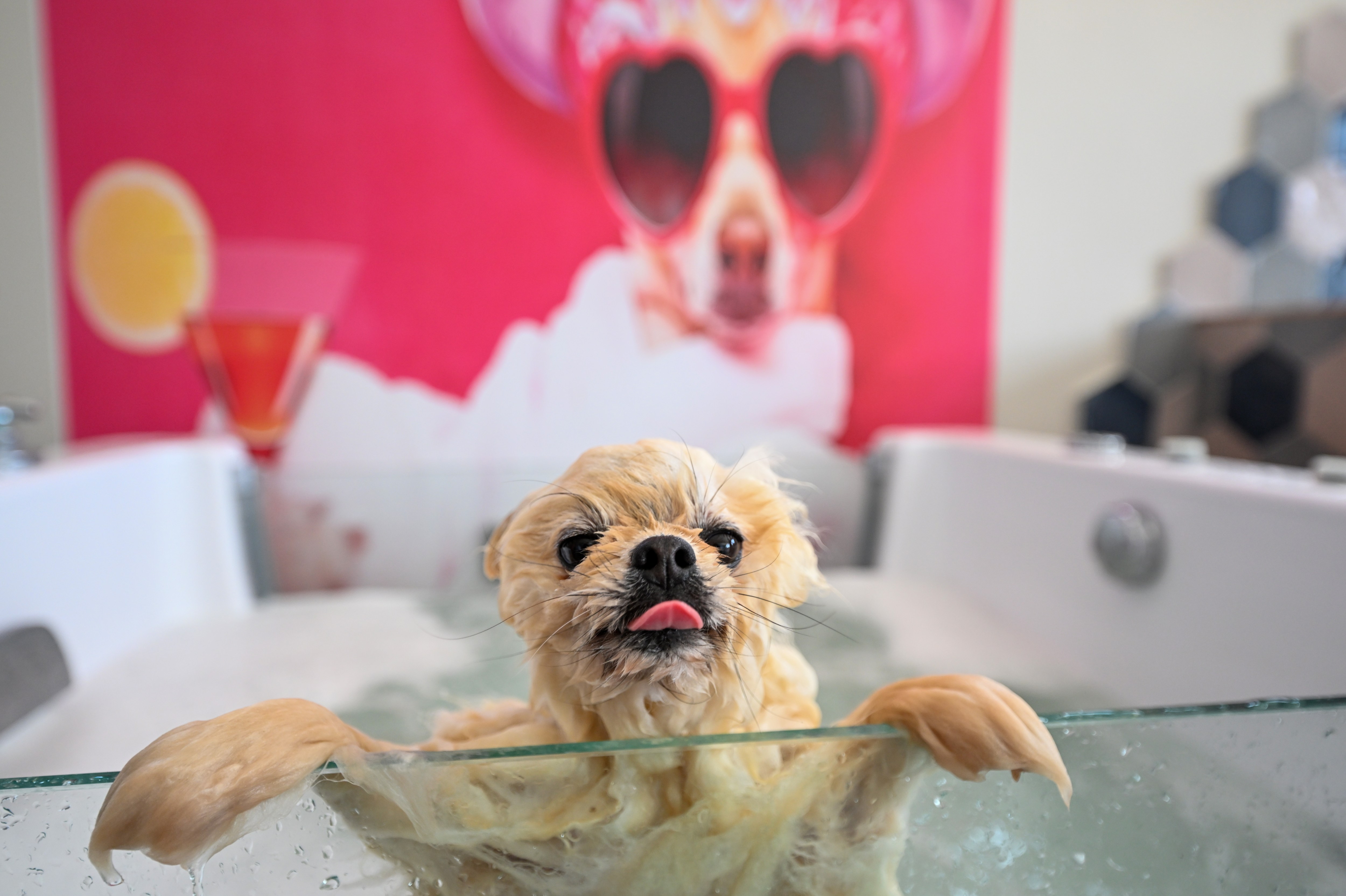A dog is getting a bath at the pet hotel ahead of the Eid al-Adha in Gaziantep, Turkiye on June 07, 2024. The pet hotel, which was established in 2021 on an area of 5.500 square meters in 2021 and has a capacity of 51 pets, offers comfortable accommodation to the animal friends left by their owners those who go out of the city during the 9-day Eid al-Adha holiday. (Photo by Adsiz Gunebakan/Anadolu via Getty Images)