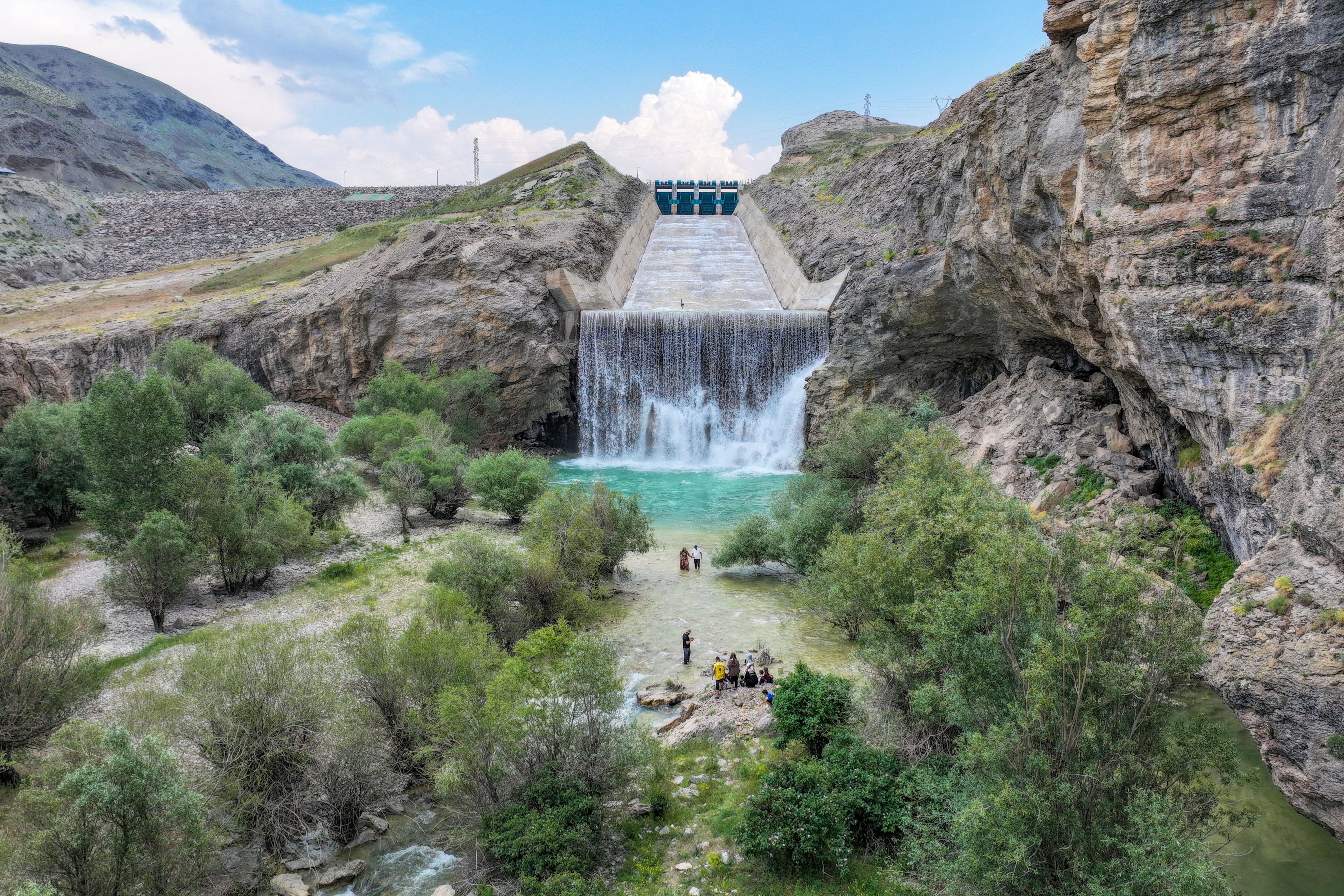 A view of the artificial waterfall at the end of the channel used for water discharge at Zernek Dam where the water level has reached 100% due to recent rains in Van, Turkiye on June 9, 2024. (Photo by Ozkan Bilgin/Anadolu via Getty Images)