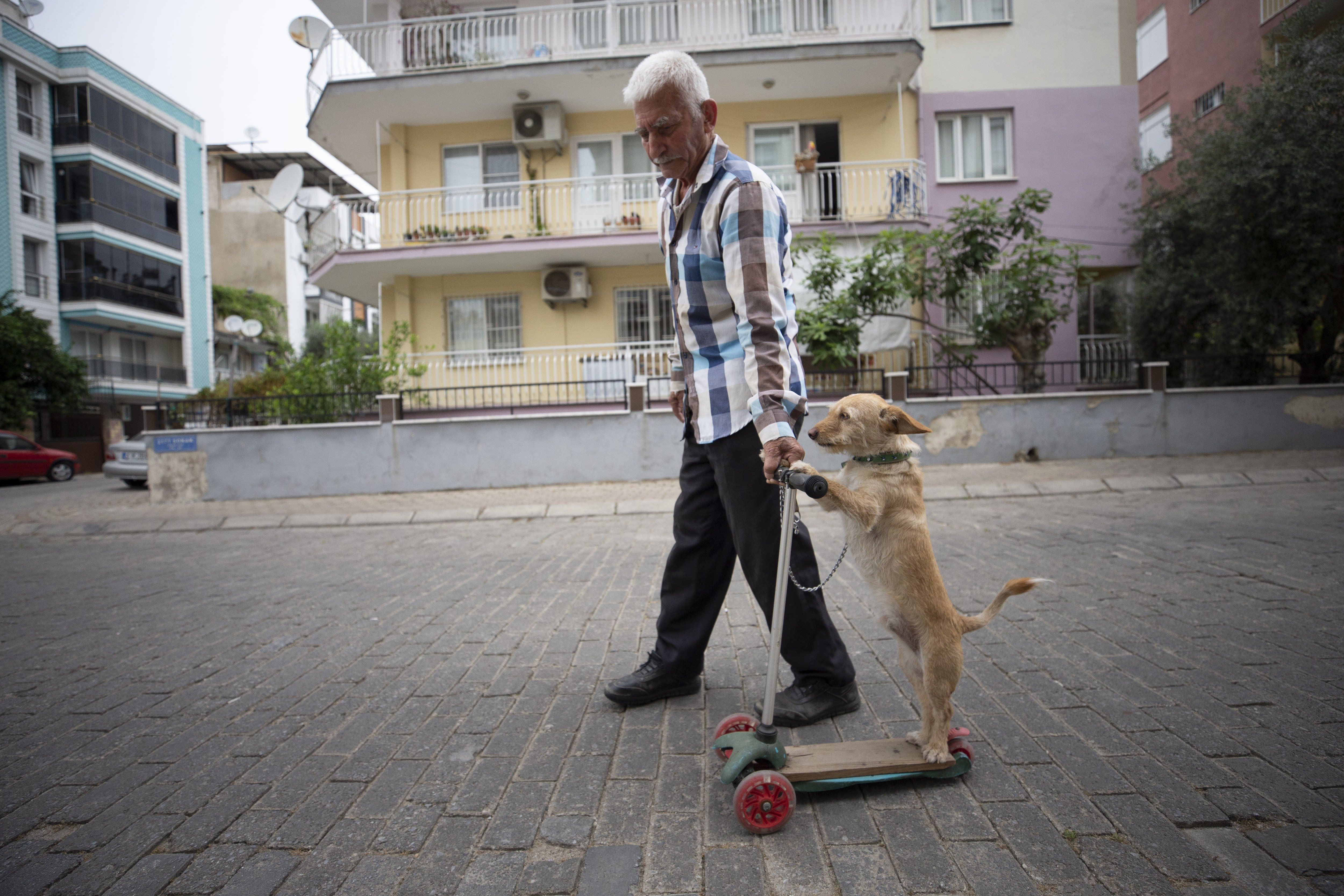Muharrem Yilmaz, 78, takes his dog “Toprak” to a scooter and a swing ride everyday in Aydin, Turkiye on June 14, 2024. Yilmaz started taking his dog to long scooter rides after realising it likes to play with his grandkids' scooter. Then, he made a swing out of fruit boxes for the dog. Yilmaz adopted his dog Toprak two years ago when he found it in a restaurant garden as a lost puppy. (Photo by Ferdi Uzun/Anadolu via Getty Images)