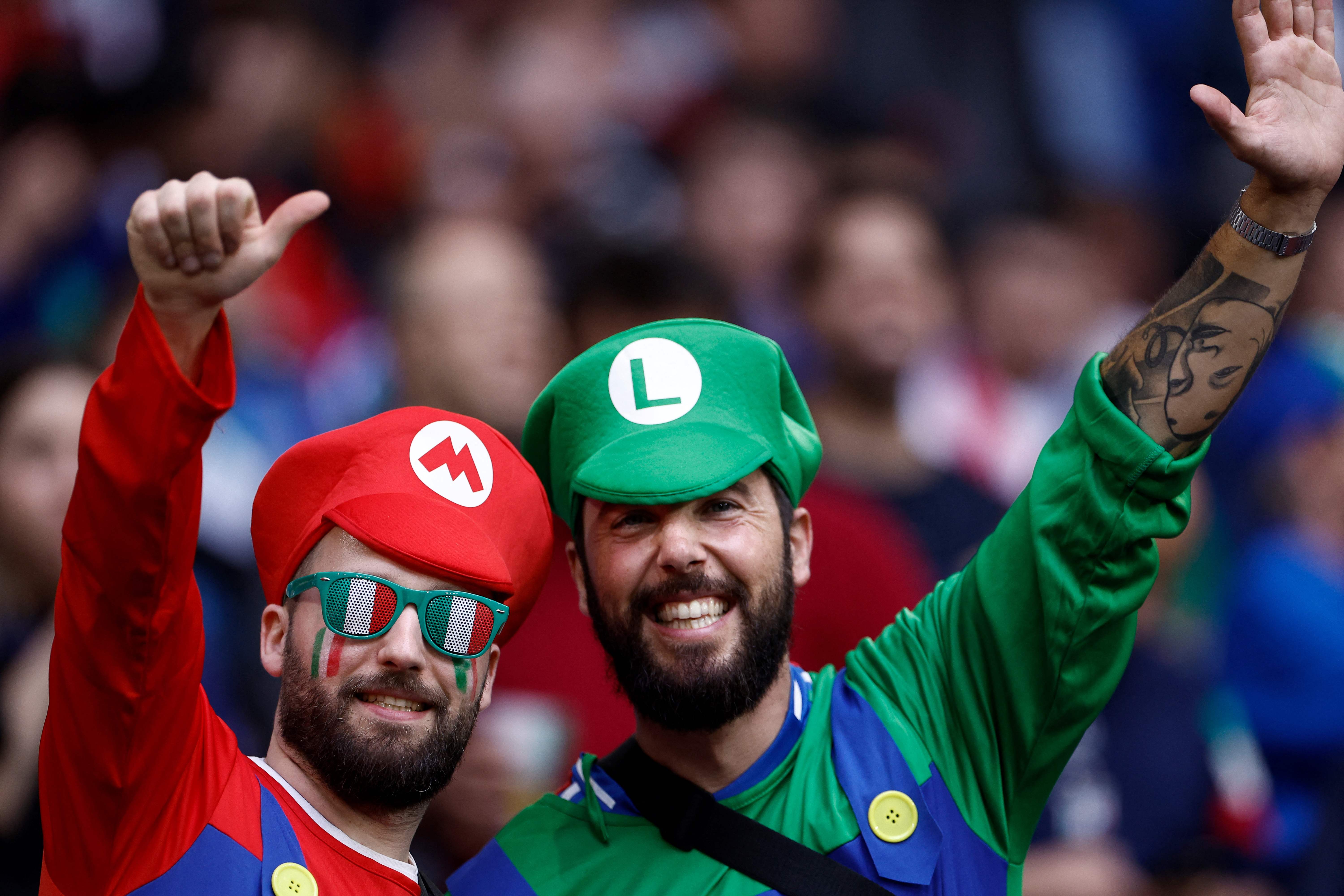Italy's supporters dressed as Mario and Luigi pose for pictures before the start of the UEFA Euro 2024 Group B football match between Spain and Italy at the Arena AufSchalke in Gelsenkirchen on June 20, 2024. (Photo by Kenzo Tribouillard/AFP Photo)