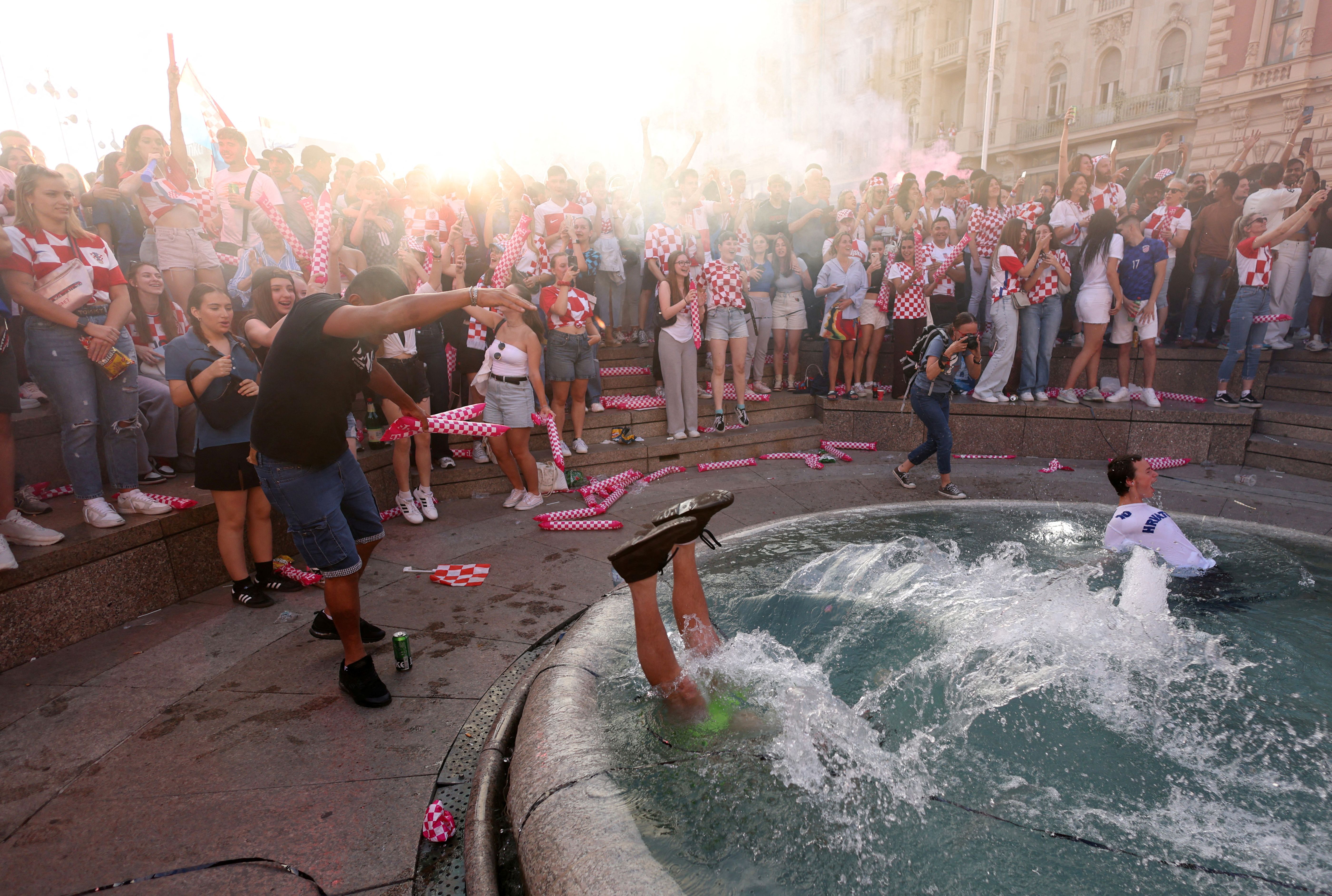 Croatia fans celebrate in a fountain after they score a goal against Spain before it is disallowed as they watch the match at Zagreb's main square during Euro 2024 in Zagreb, Croatia, on June 15, 2024. (Photo by Antonio Bronic/Reuters)