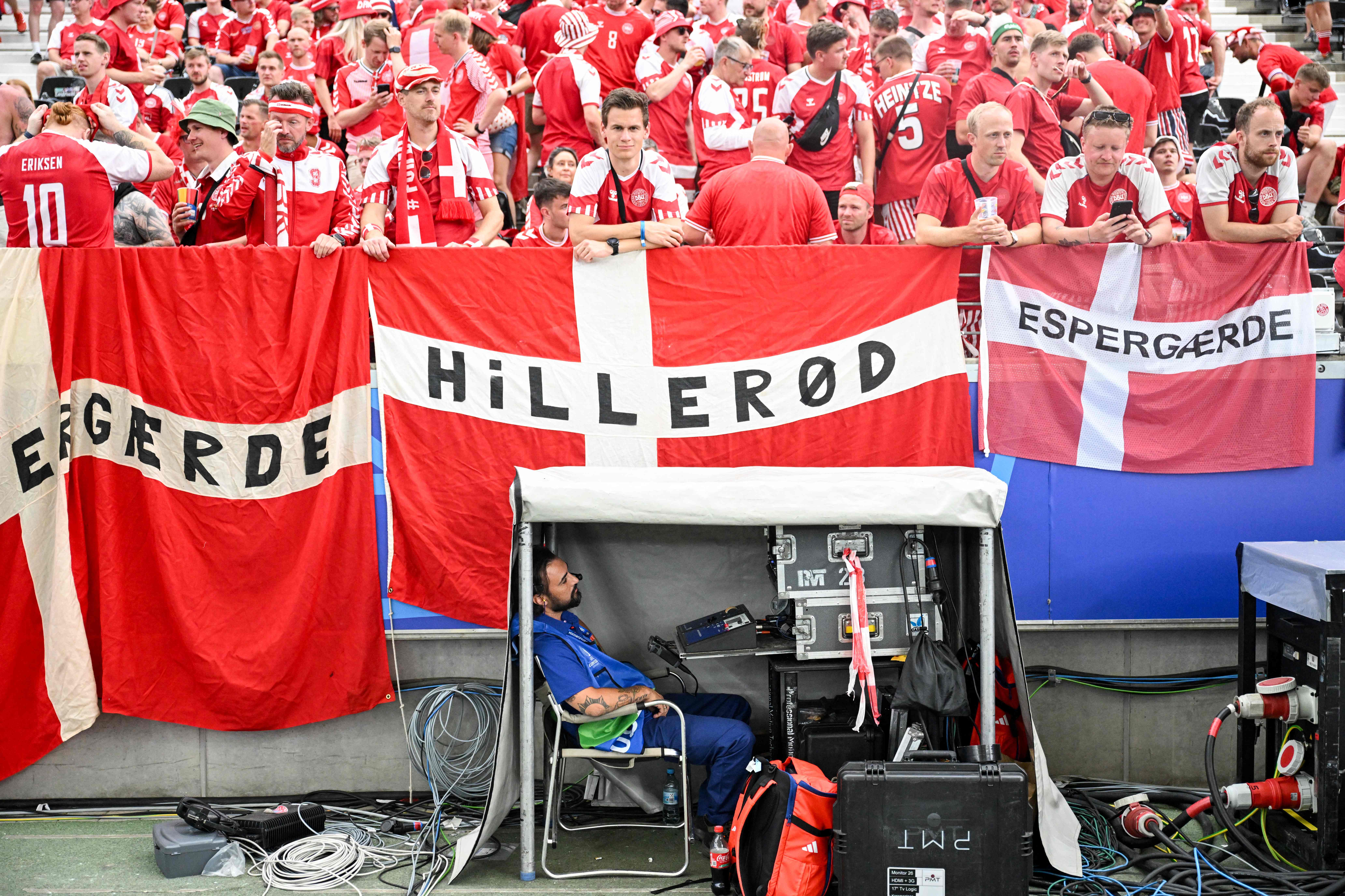A television technician waits below Denmark's fans prior to the UEFA Euro 2024 Group C football match between Denmark and England at the Frankfurt Arena in Frankfurt am Main on June 20, 2024. (Photo by Kirill Kudryavtsev/AFP Photo)