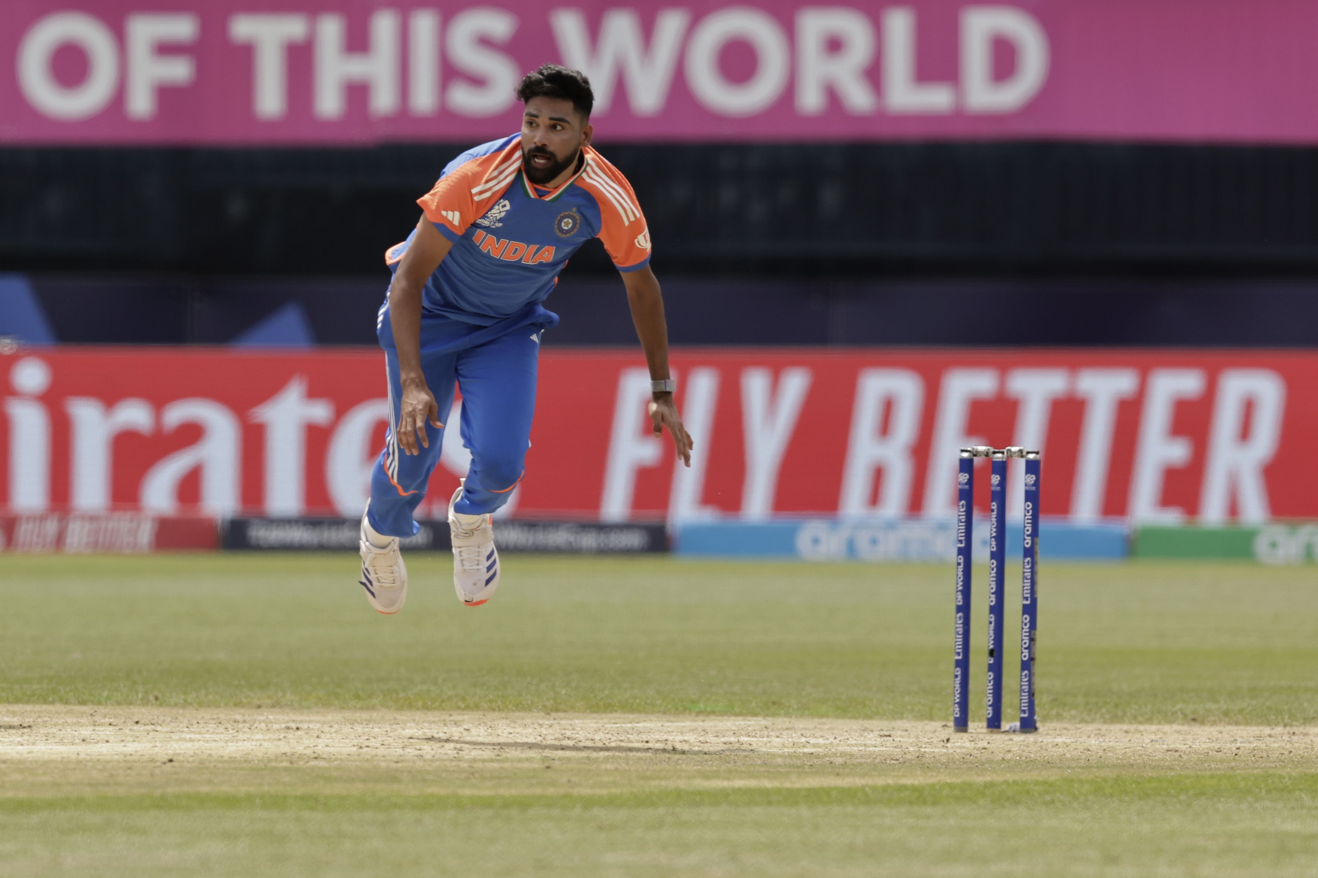 India's Mohd Siraj reacts after bowling a delivery during the ICC Men's T20 World Cup cricket match between United States and India at the Nassau County International Cricket Stadium in Westbury, New York, Wednesday, June 12, 2024. (Photo by Adam Hunger/AP Photo)