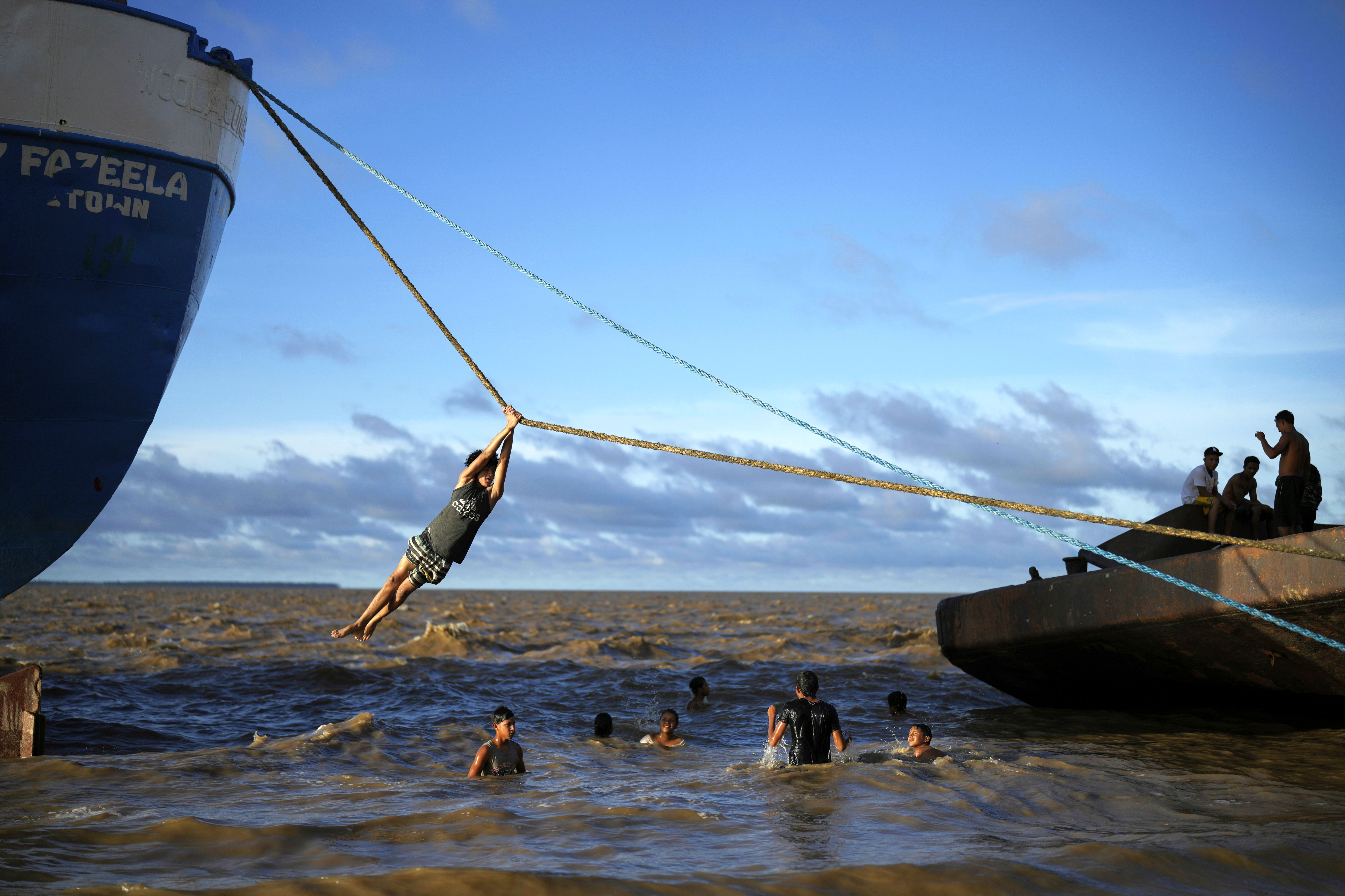 Children play with the ropes of a ship docked on a beach in Parika, Guyana, Sunday, June 9, 2024. (Photo by Ramon Espinosa/AP Photo)