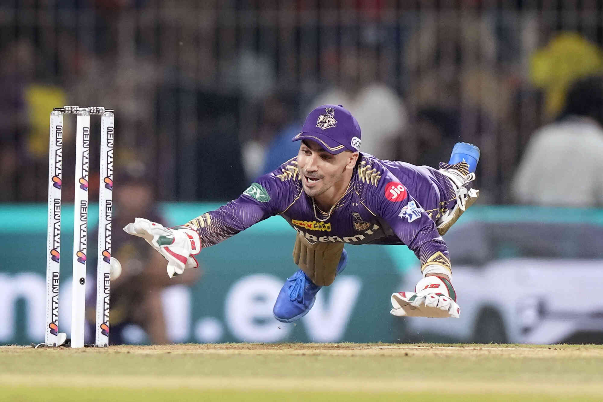 Kolkata Knight Riders' wicketkeeper Rahmanullah Gurbaz dives to make an unsuccessful attempt to run out Sunrisers Hyderabad's Abhishek Sharma during the Indian Premier League cricket final match between Kolkata Knight Riders and Sunrisers Hyderabad in Chennai, India, Sunday, May 26, 2024. (Photo by Mahesh Kumar A./AP Photo)