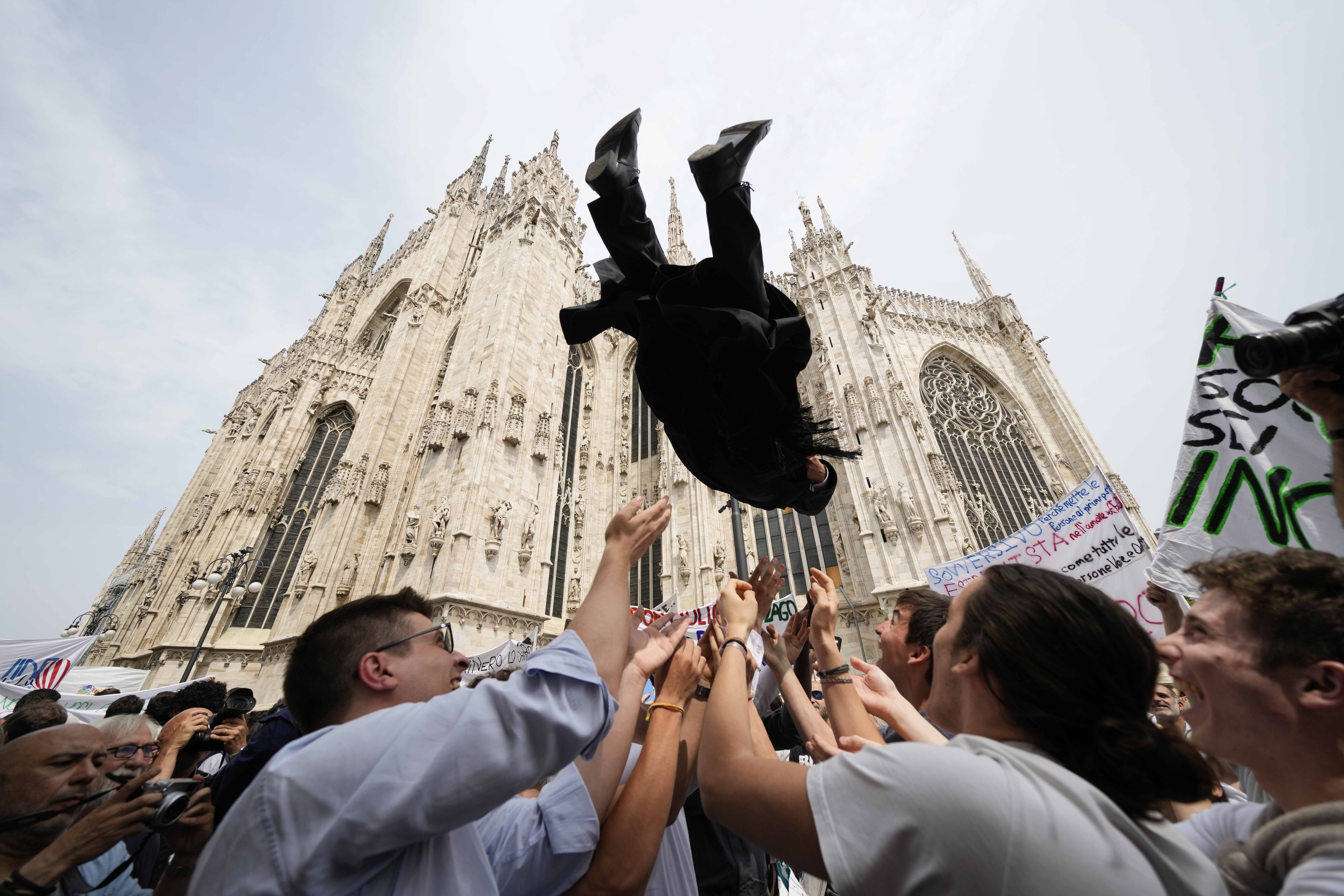 A newly ordered Catholic priest is launched in the air by friends and family outside the Duomo Cathedral after his ordination ceremony in Milan, Italy, Saturday, June 8, 2024. (Photo by Luca Bruno/AP Photo)