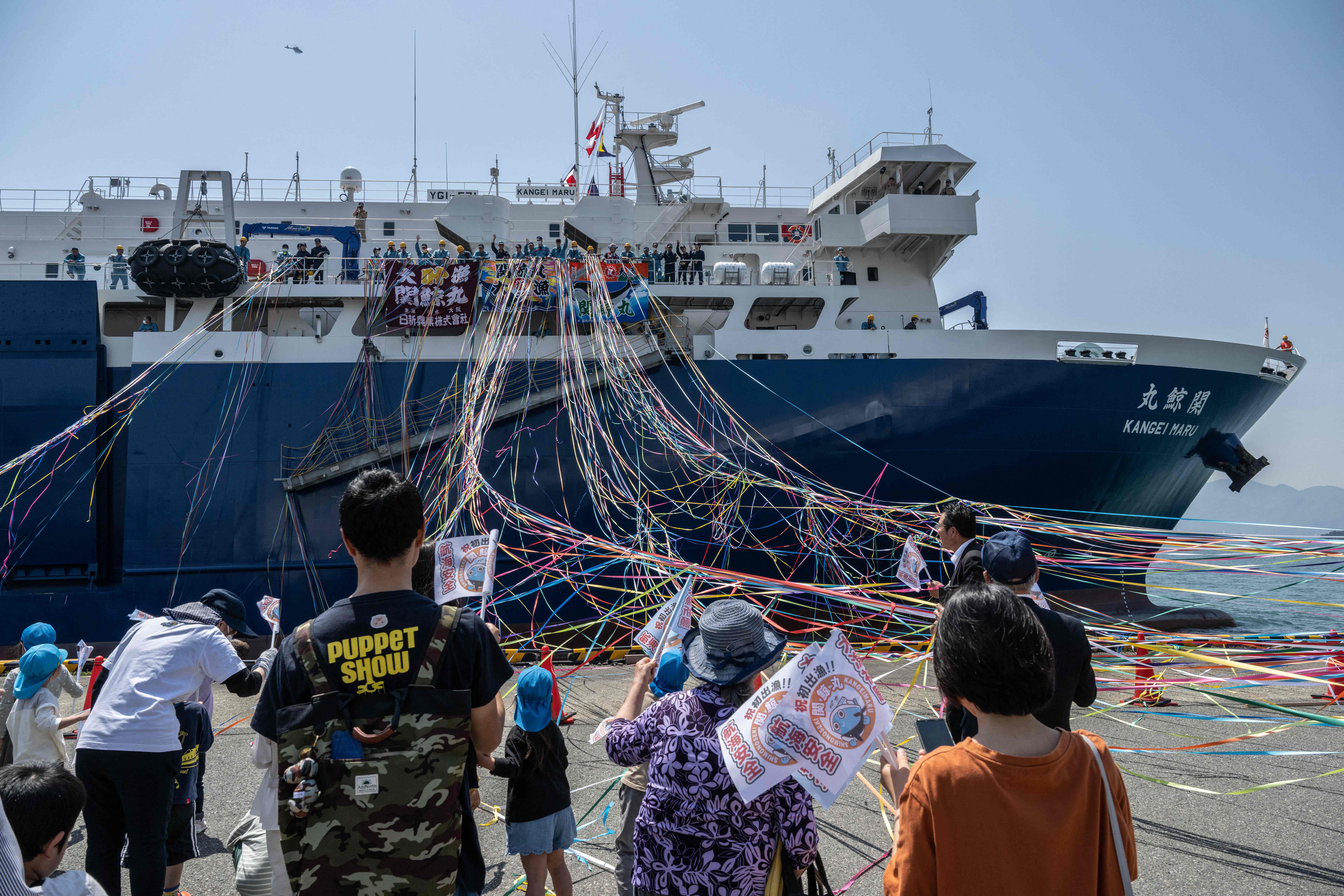 People see off Japan's new whaling mothership, the Kangei Maru, after the ship's launch ceremony at a port in Shimonoseki city, Yamaguchi prefecture on May 21, 2024. The nearly 9,300-tonne ship set sail on its maiden hunting voyage on May 21, heralding a new era for the controversial practice defended by the government as an integral part of national culture. (Photo by Yuichi Yamazaki/AFP Photo)