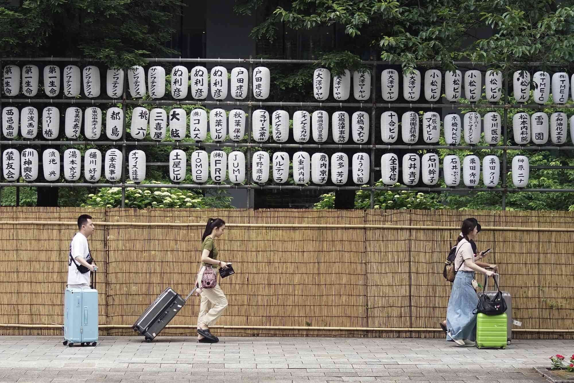 Tourists walk near festive lanterns Monday, May 27, 2024, in Tokyo. The names of the festival sponsors are written on the lanterns. (Photo by Eugene Hoshiko/AP Photo)