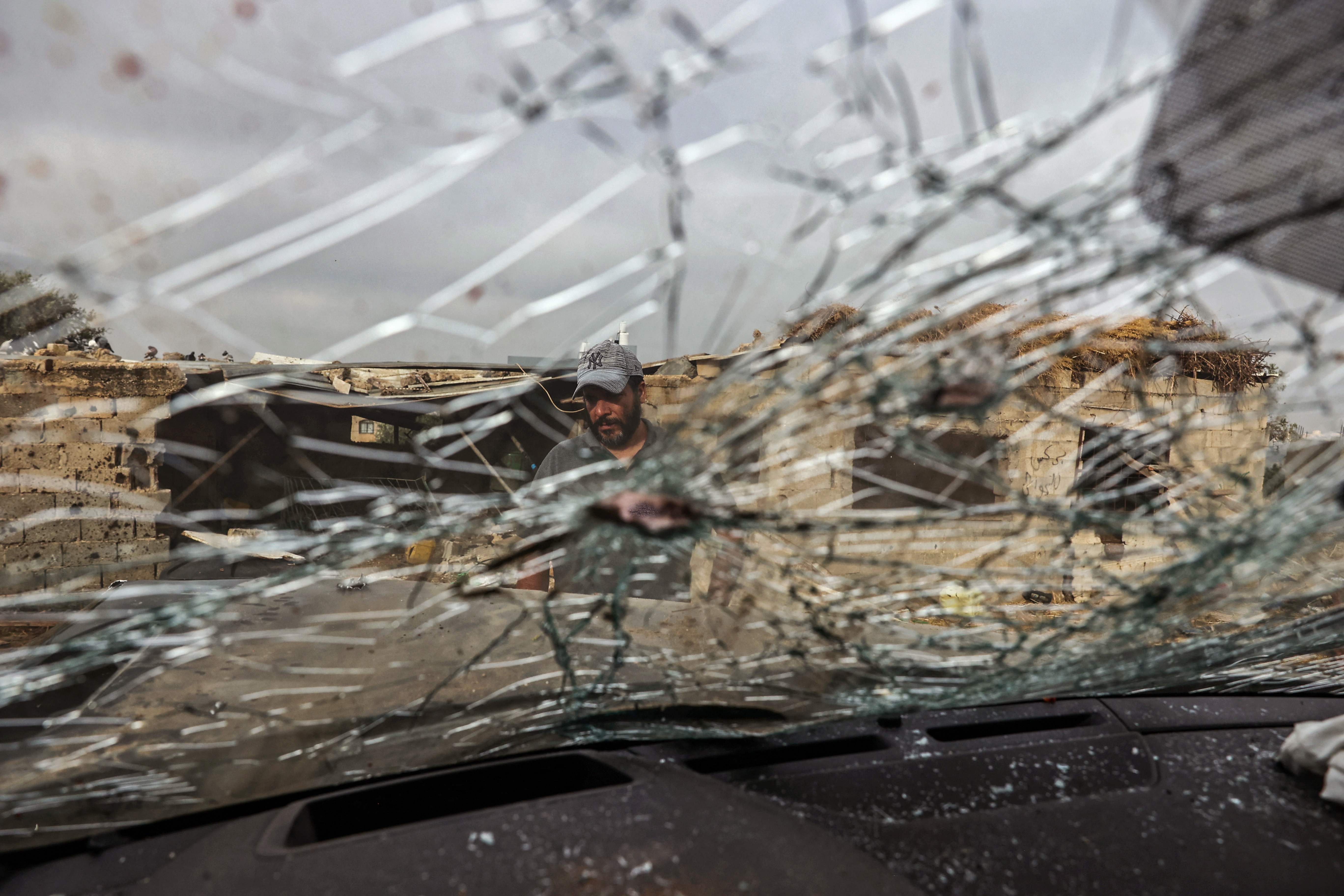A Palestinian man inspects the carcass of one of two cars targeted by Israeli forces during a raid in which four Palestinians were killed a day earlier in Kfar Naima, north-west of Ramallah in the occupied West Bank on June 11, 2024. Israeli forces killed four Palestinians on June 10 in the occupied West Bank, the Palestinian Authority said, one of whom the military said had started a fire at an Israeli settler outpost. (Photo by Zain Jaafar/AFP Photo)