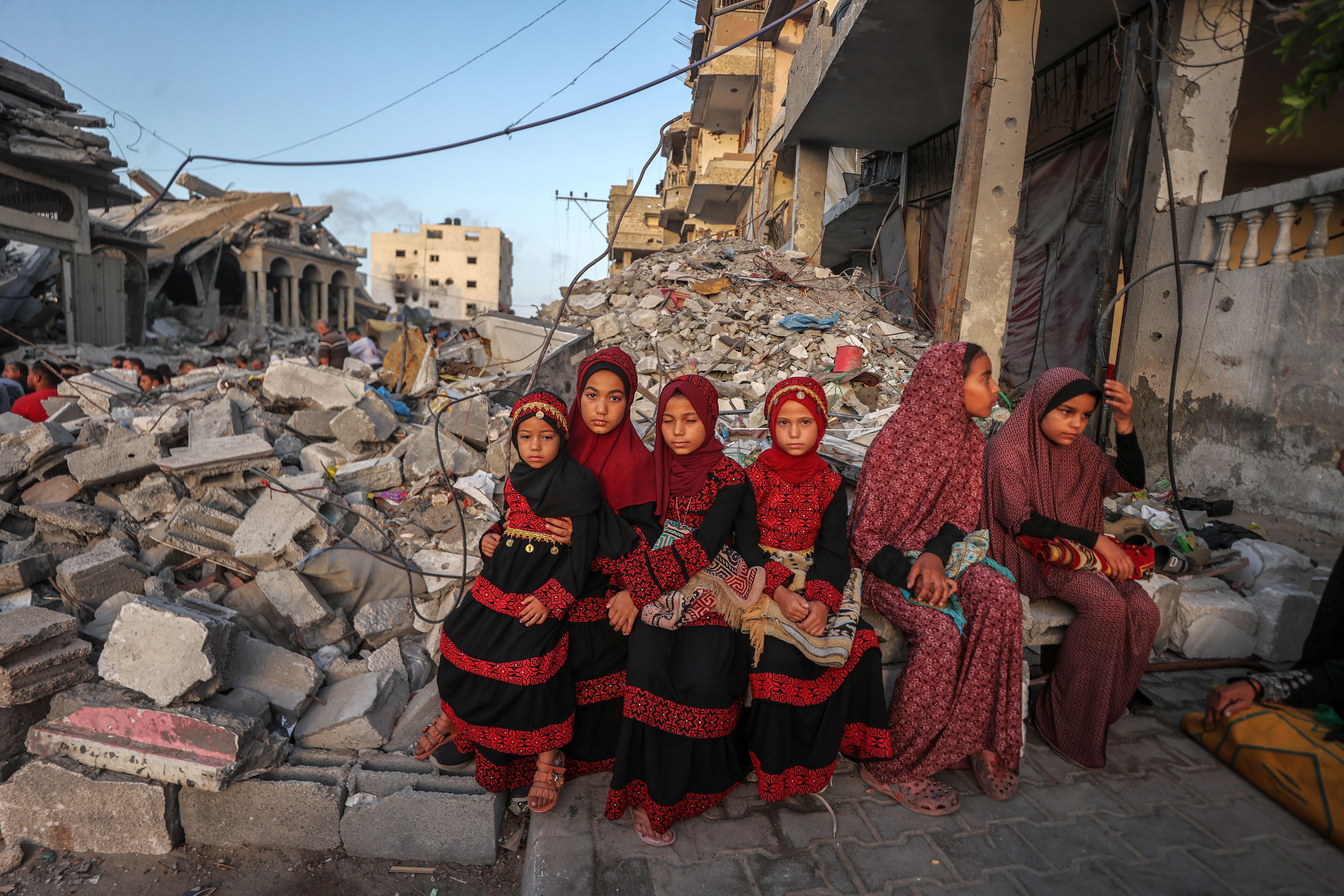 Palestinians gather to perform Eid al-Adha prayer among the rubble of buildings destroyed by Israeli forces, as the Israeli attacks and blockades continue in Khan Yunis, Gaza on June 16, 2024. (Photo by Ali Jadallah/Anadolu via Getty Images)