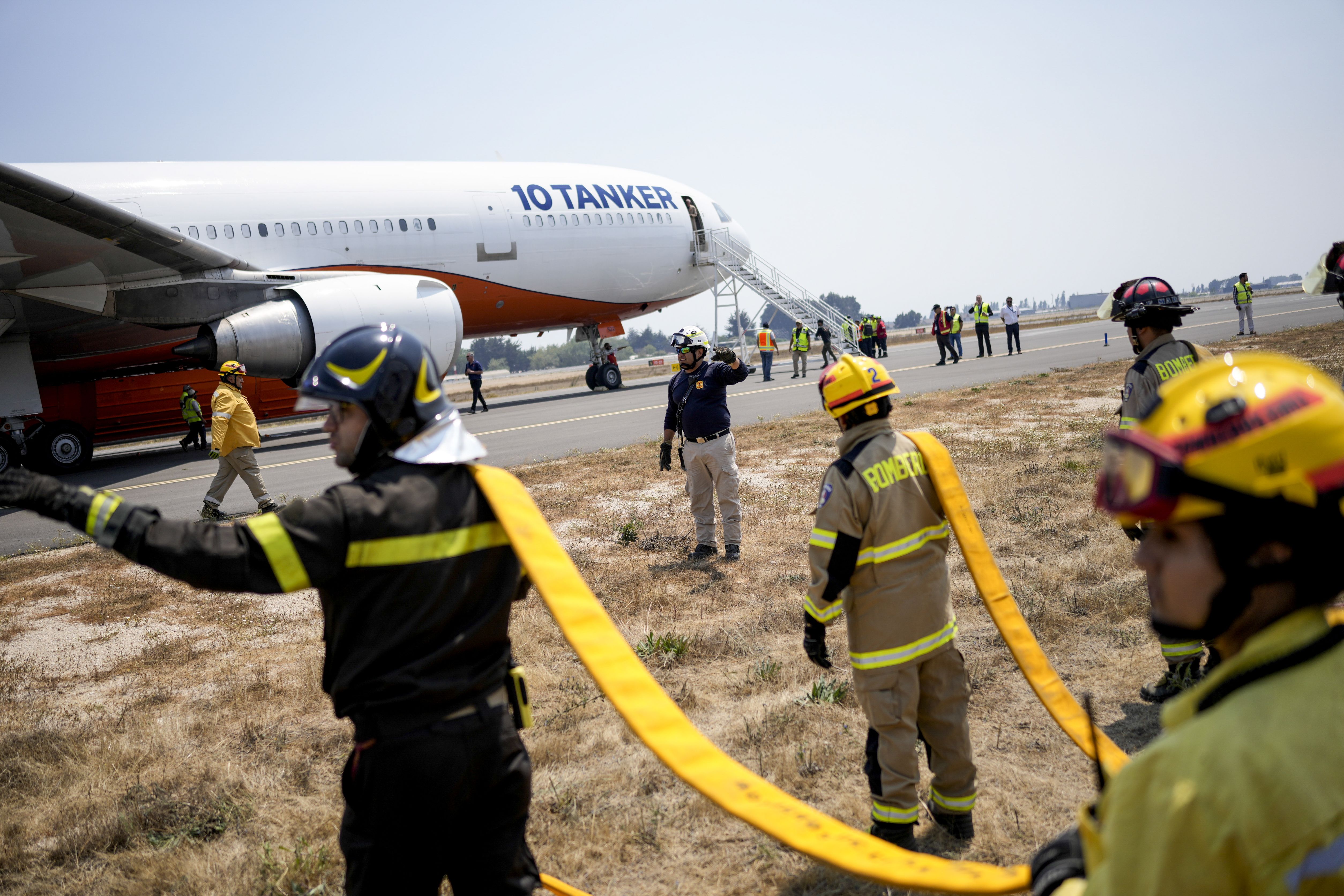 Firefighters load water on to the 10 Tanker plane at the airport as they fight forest fires, in Talcahuano, Chile, Monday, February 6, 2023. Wildfires are spreading in southern and central Chile, triggering evacuations and the declaration of a state of emergency in some regions. (Photo by Matias Delacroix/AP Photo)