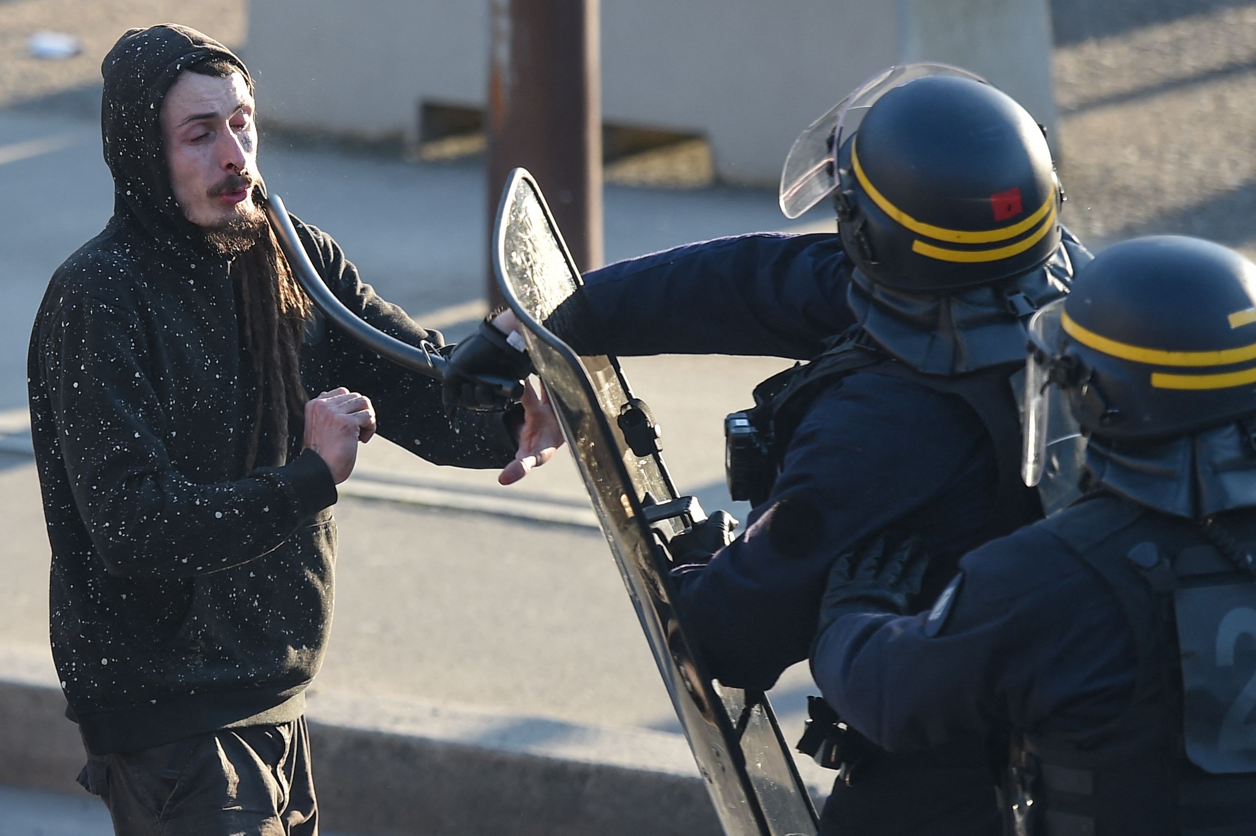 A protester receives a blow with a baton by a French riot policeman on the sidelines of a demonstration on the fourth day of nationwide rallies organised since the start of the year, against a deeply unpopular pensions overhaul, in Nantes on February 11, 2023. (Photo by Sebastien Salom-Gomis/AFP Photo)
