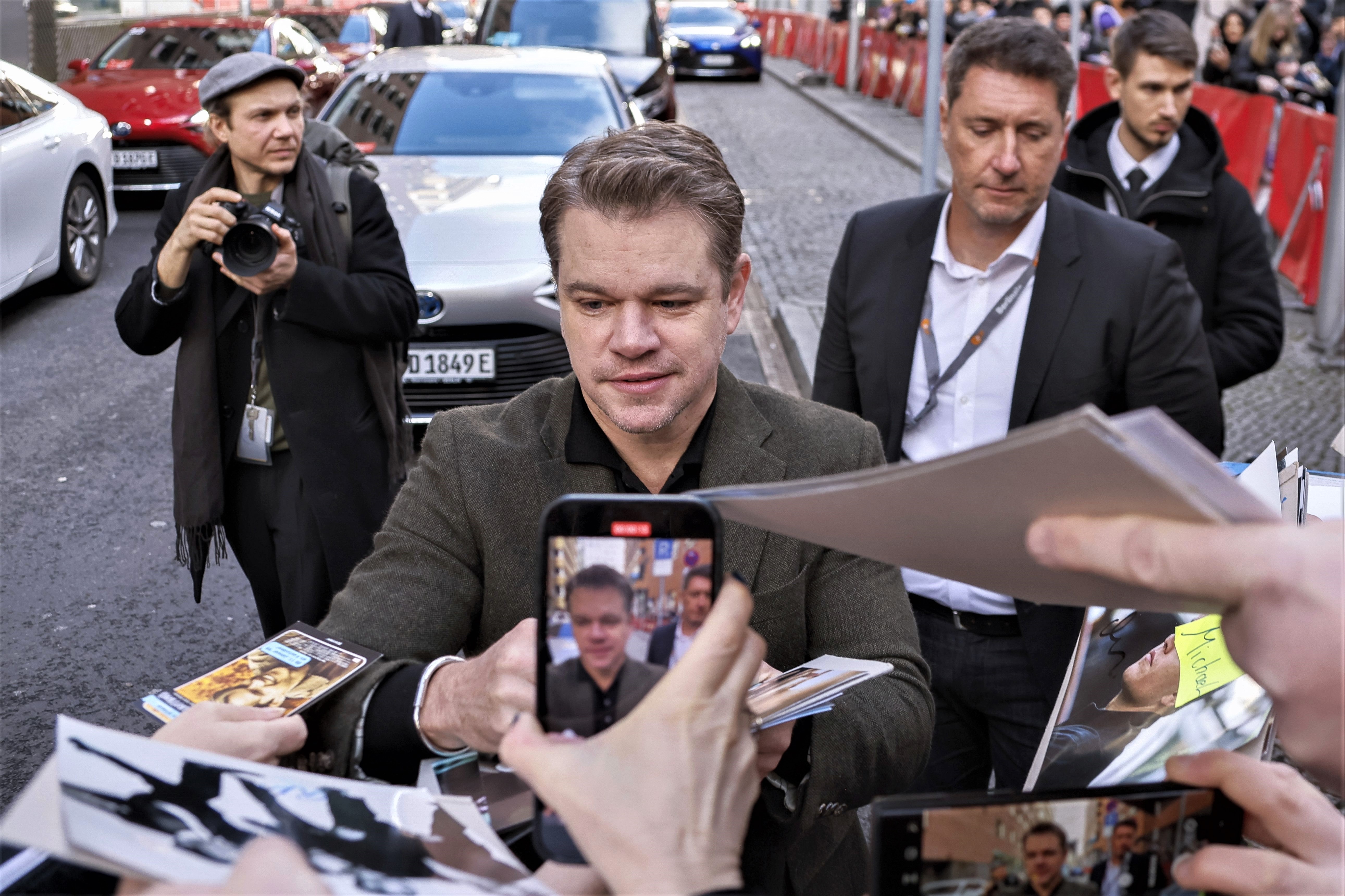 American actor Matt Damon poses signs autographs upon arrival for the photo call for the film “Kiss The Future” during the International Film Festival 'Berlinale', in Berlin, Germany, Sunday, February 19, 2023. (Photo by Joel C Ryan/Invision/AP Photo)