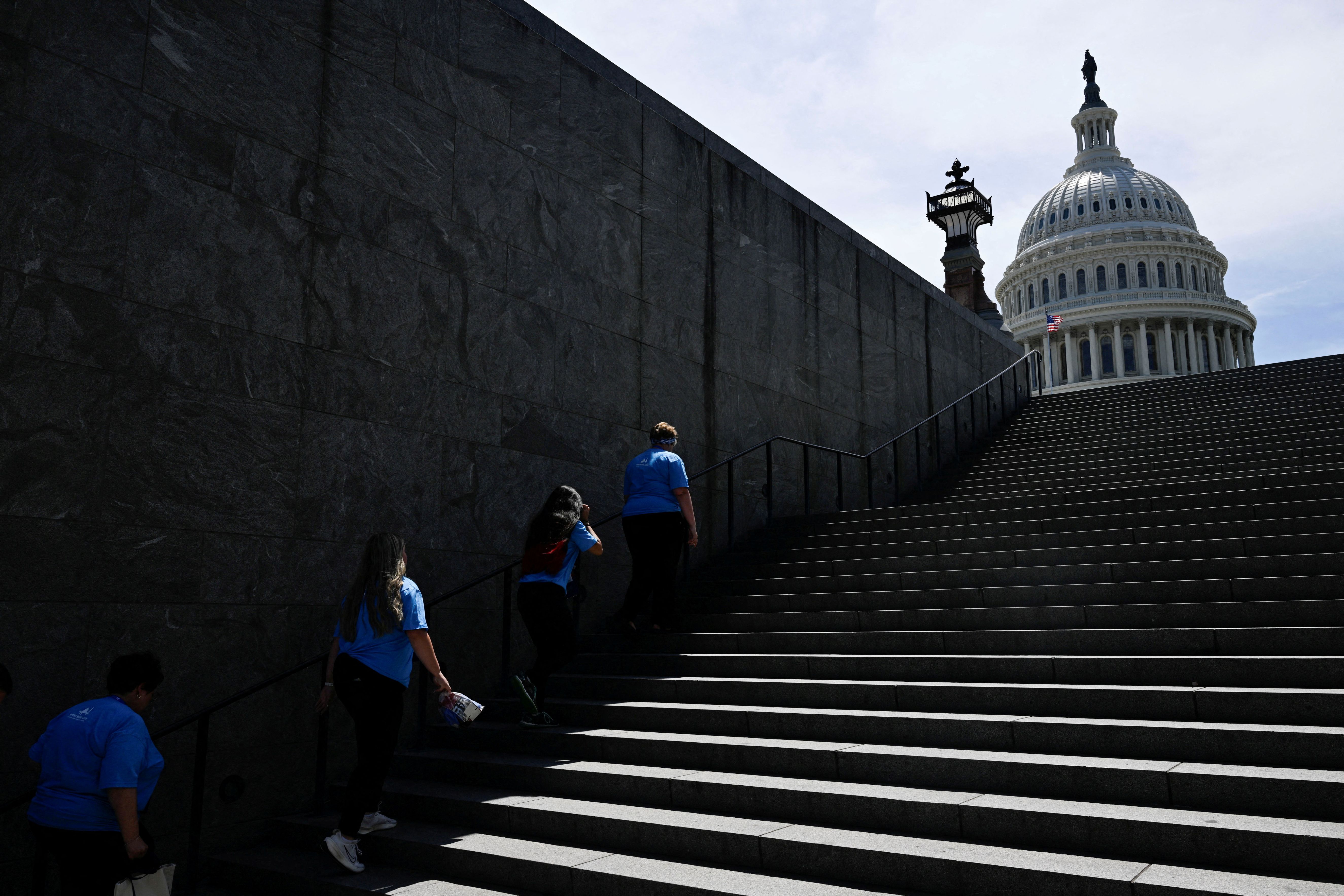 Visitors ascend the last remaining part of shade of a set of stairs on Capitol Hill amid a heat wave in Washington on June 19, 2024. (Photo by Craig Hudson/Reuters)