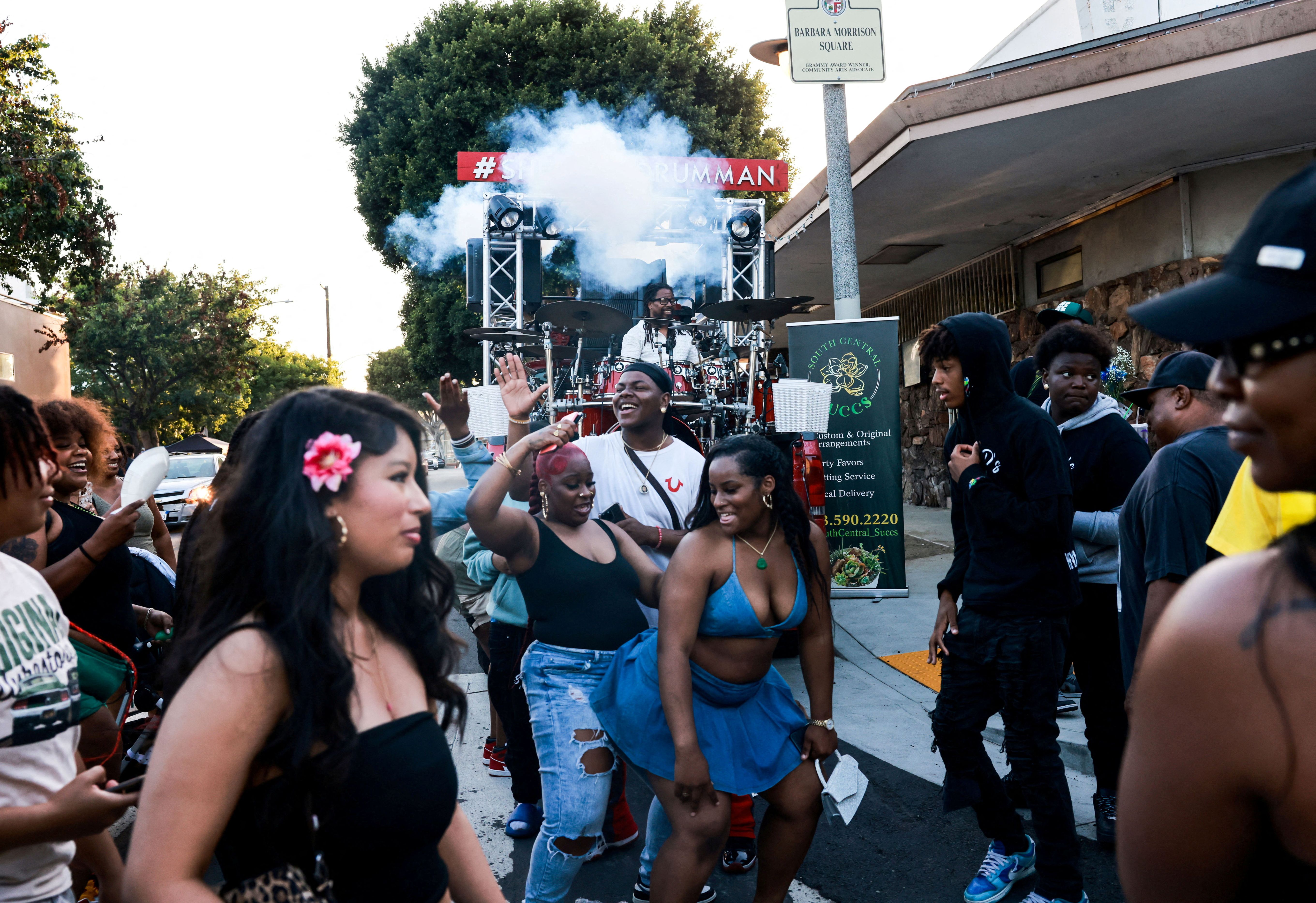 People attend a gathering to mark Juneteenth in Leimert Park, in Los Angeles on June 19, 2024. (Photo by Aude Guerrucci/Reuters)