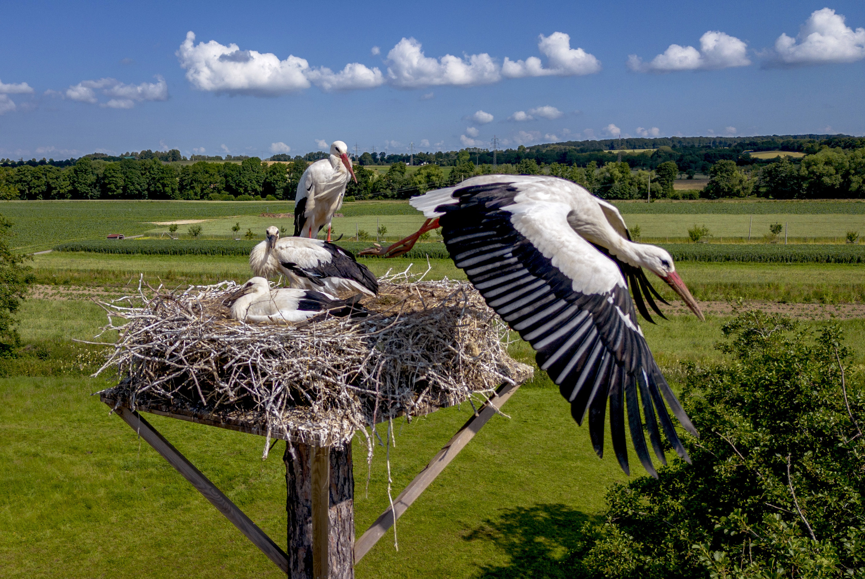 A stork starts from its nest while the family looks on in the outskirts of Wehrheim near Frankfurt, Germany, Monday, June 24, 2024. (Photo by Michael Probst/AP Photo)