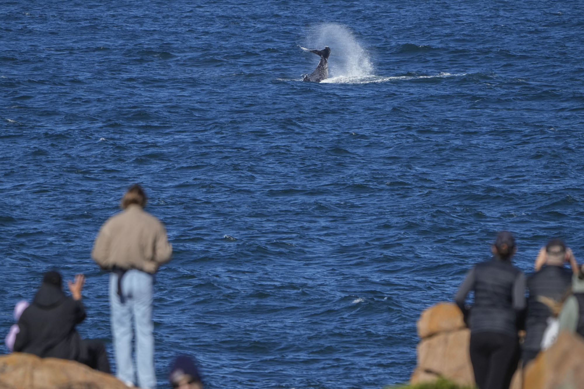Spectators watch a whale swim past at Boat Harbour north of Sydney, Australia, Monday, June 10, 2024. More than 40,000 whales make their way along the NSW coast on their northern migration, known as the Humpback Highway, from May to November each year. (Photo by Mark Baker/AP Photo)